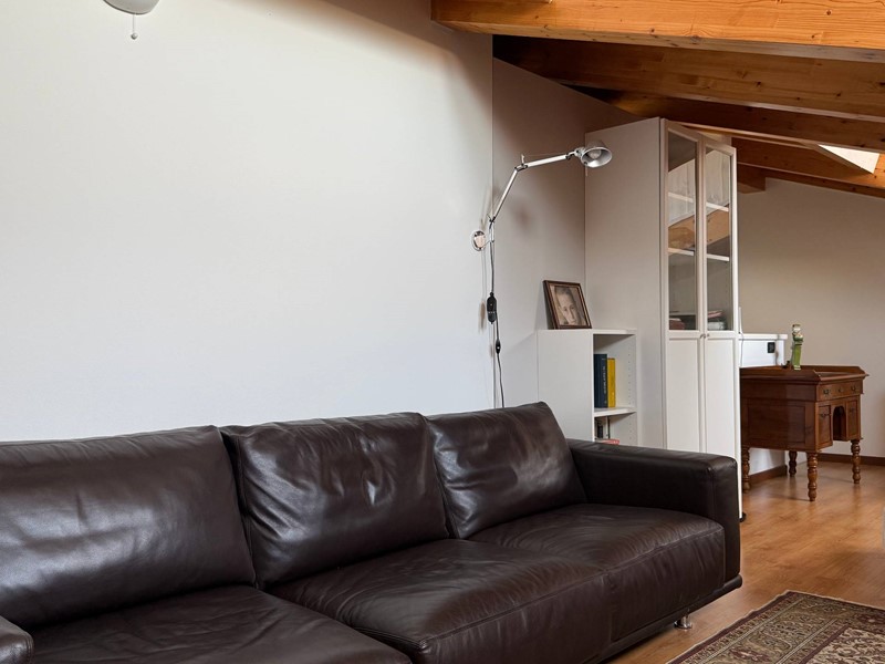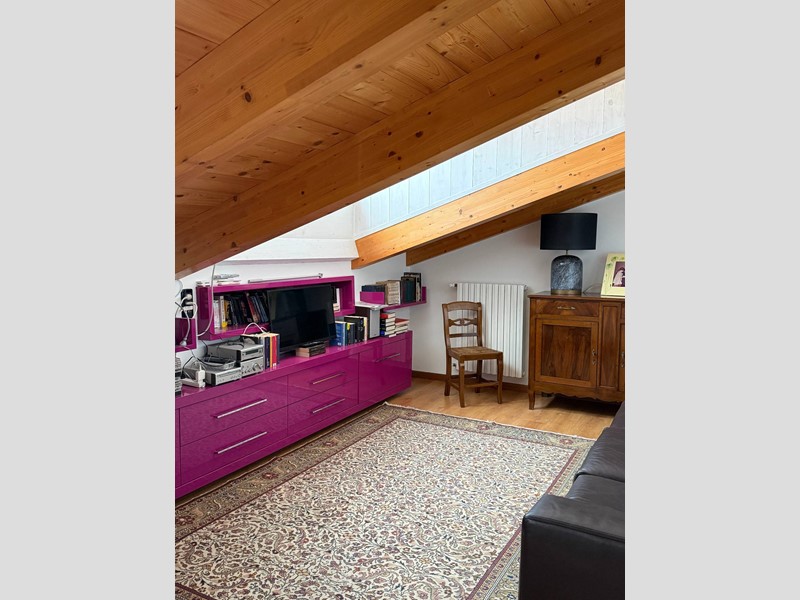 Salendo al piano mansardato, si apre una zona versatile e suggestiva che ospita uno spazio studio, una zona TV e una seconda camera da letto completa di cabina armadio, perfetta come ambiente particolarmente riservato.