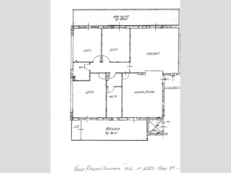 E' così composta: ingresso principale su salone, ingresso di servizio su grande cucina/soggiorno con annessa veranda, corridoio/disimpegno, camera matrimoniale, altre due camere, wc bagno, wc doccia e ripostiglio.