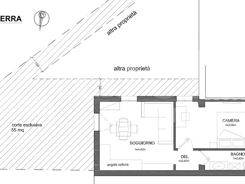L'immobile è composto da zona giorno con angolo cottura, camera da letto, bagno, corte esclusiva di oltre 50 mq. La proprietà è completata da una cantina interrata.