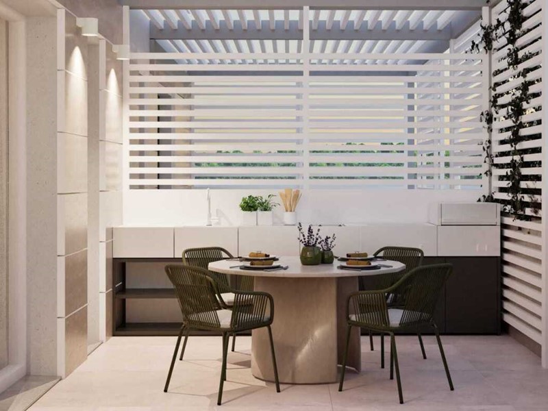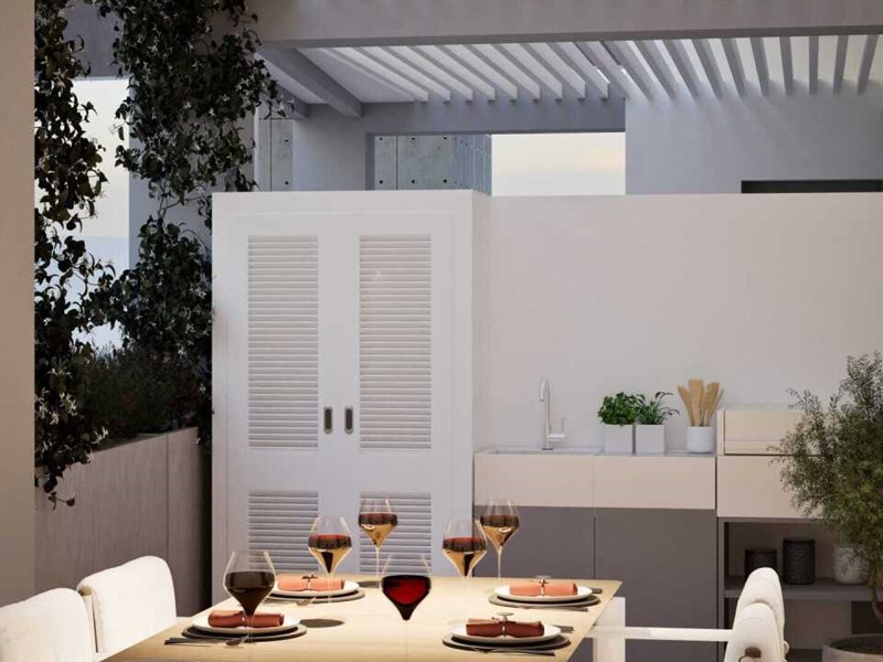All'ingresso ci accoglie una grande zona pranzo-living (ambiente unico) con cucina parzialmente a vista, disimpegno, 2 comodi vani letto di cui uno con cabina armadio, 2 bagni comodi di cui uno in camera. Area esterna di proprietà esclusiva per una superficie totale di mq 43 divisa in 2 zone, la prima di mq 19 che consente l'accesso autonomo all'abitazione, la seconda di mq 24 a totale servizio della zona giorno. Esposizione angolare. Pergole bioclimatiche incluse.