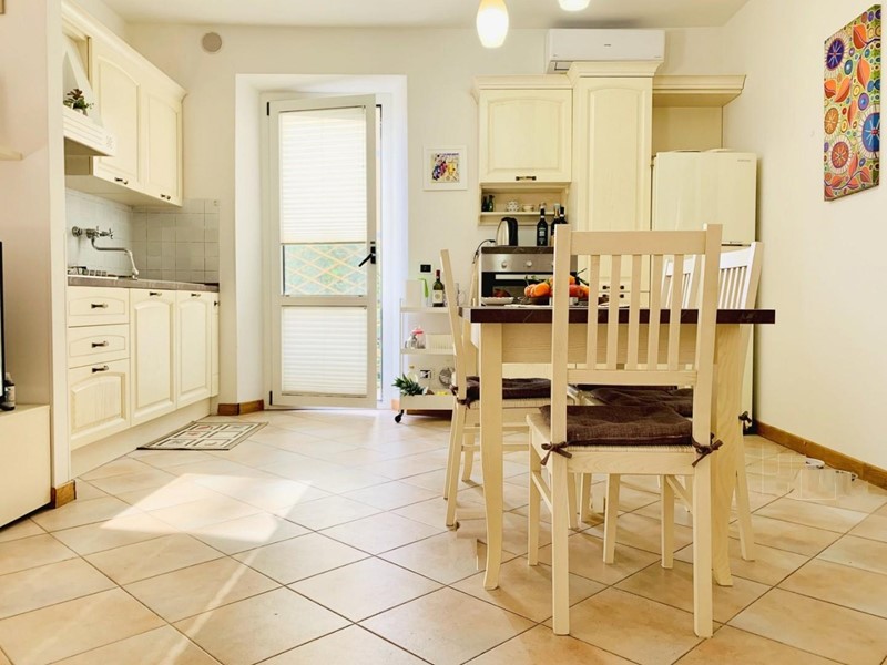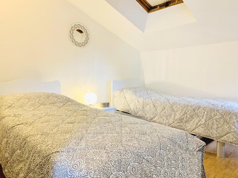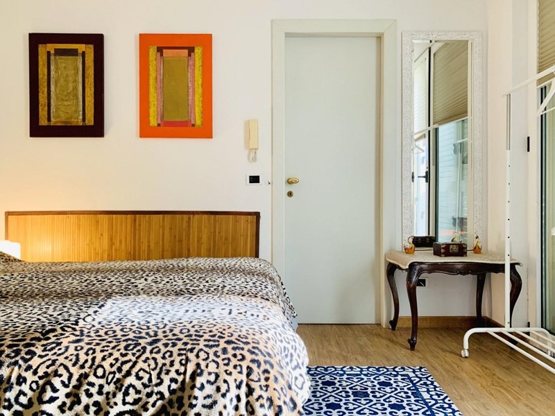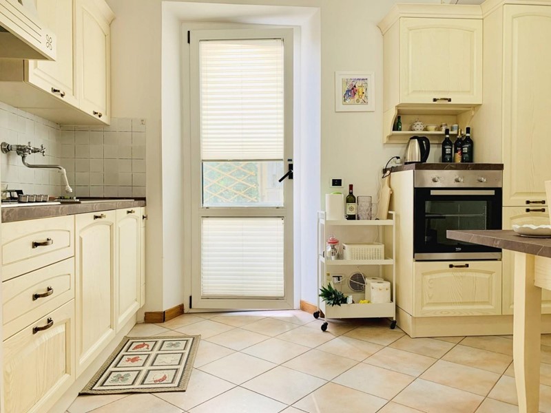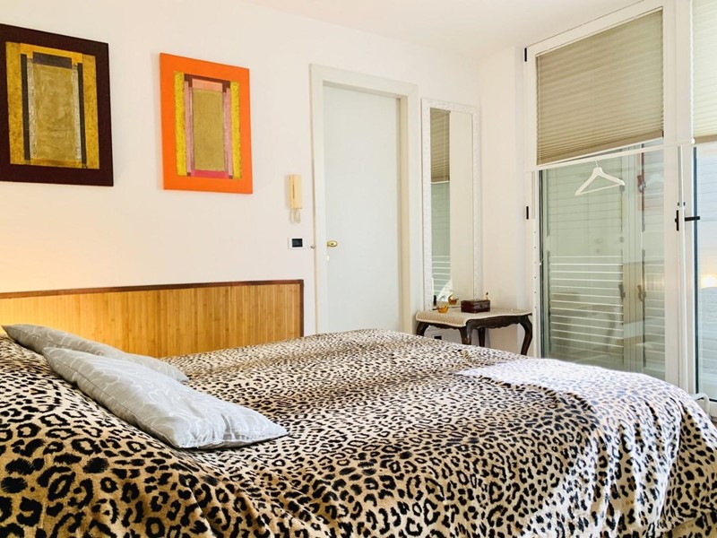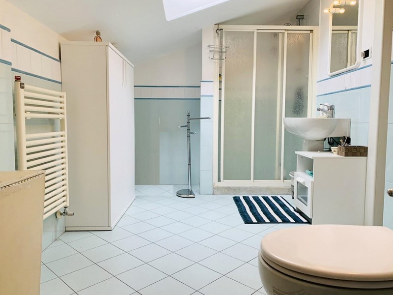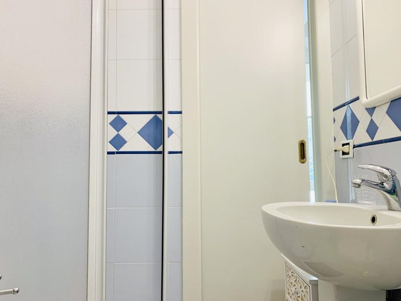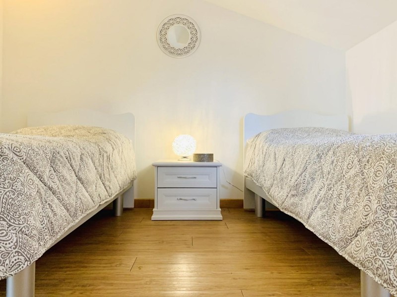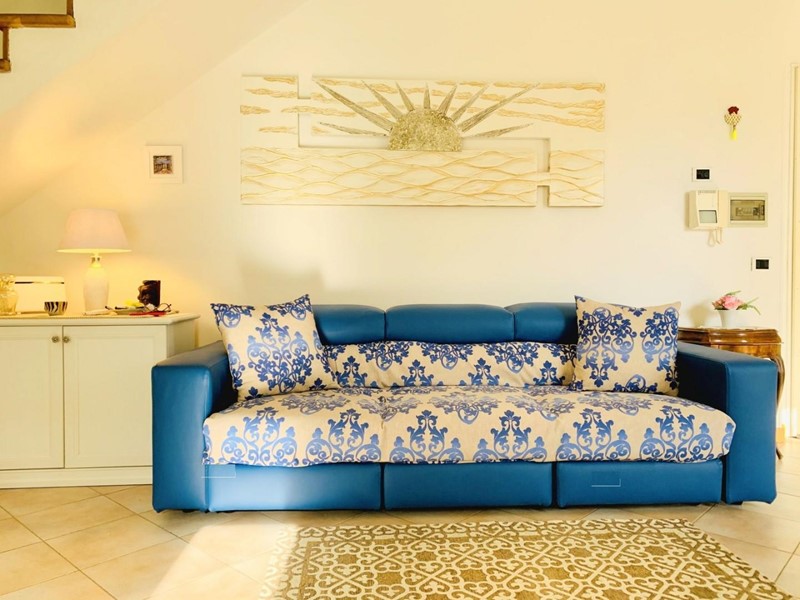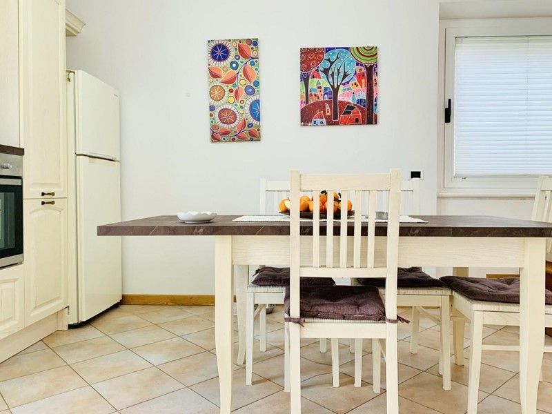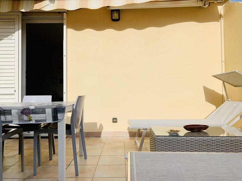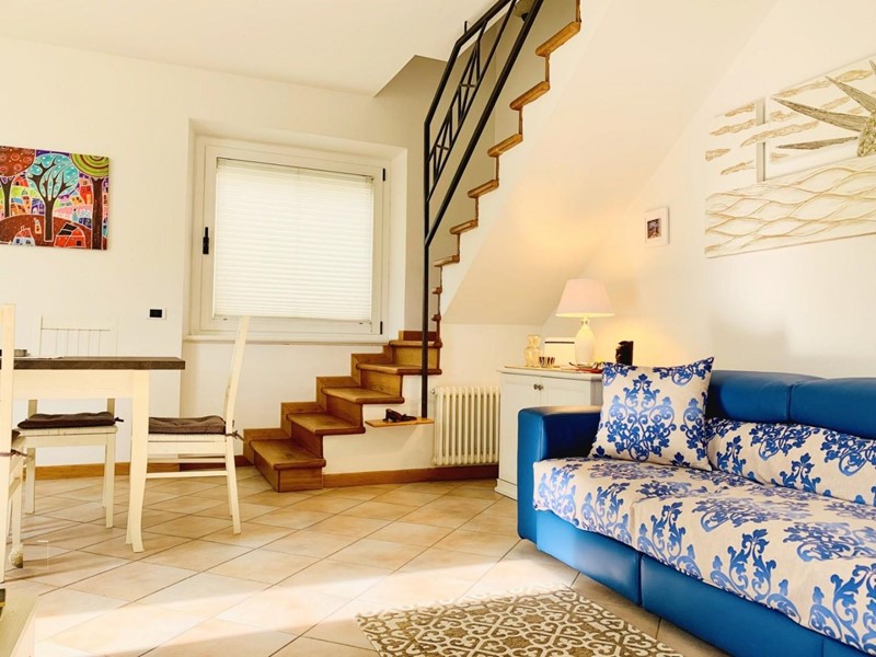 L'ingresso all'alloggio avviene nella generosa zona giorno suddivisa in angolo cottura, sala pranzo, soggiorno TV. Da questo spazioso ambiente si accede ad una grande ed esclusiva terrazza dotata sia di impianto di irrigazione che di tenda motorizzata automatizzata. Questo livello dispone di un antibagno ed un bagno con la doccia. Attraverso la scala in legno si sale a piano superiore dove trovano posto una camera matrimoniale di passaggio (2 Pax) ed una camera doppia (2 Pax). Questo piano è servito da un secondo bagno con doccia ed un balcone. Posto bici/scooter in resede comune, chiusa.