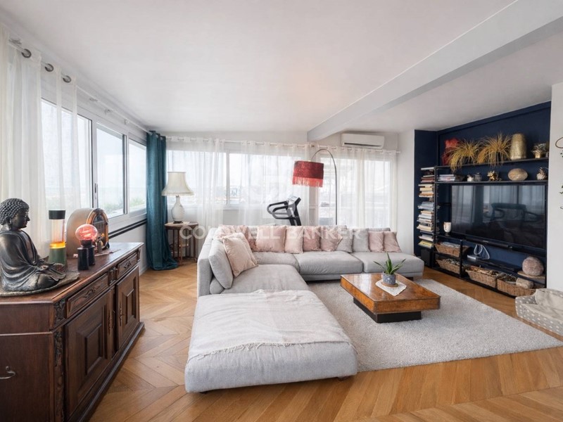 Ingresso su ampio e luminoso soggiorno con cucina a vista, con accesso a uno dei balconi e affaccio panoramico