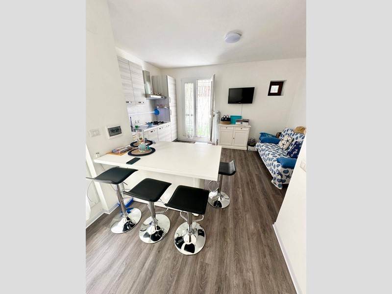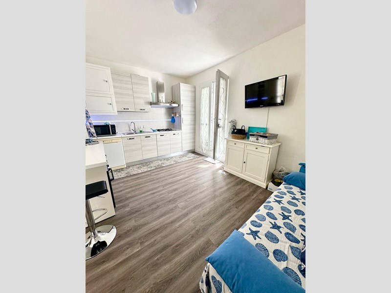 La zona giorno è composta da un soggiorno luminoso con cucina a vista, ideale per trascorrere piacevoli momenti in compagnia.