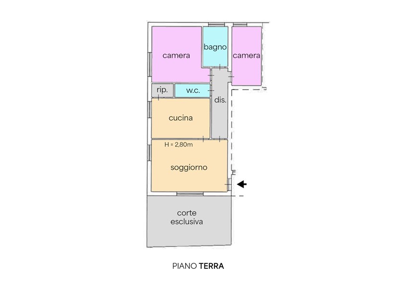 Questo appartamento al piano terra, si apre su un'accogliente soggiorno collegato alla cucina abitabile, separata e arricchita da un pratico ripostiglio.