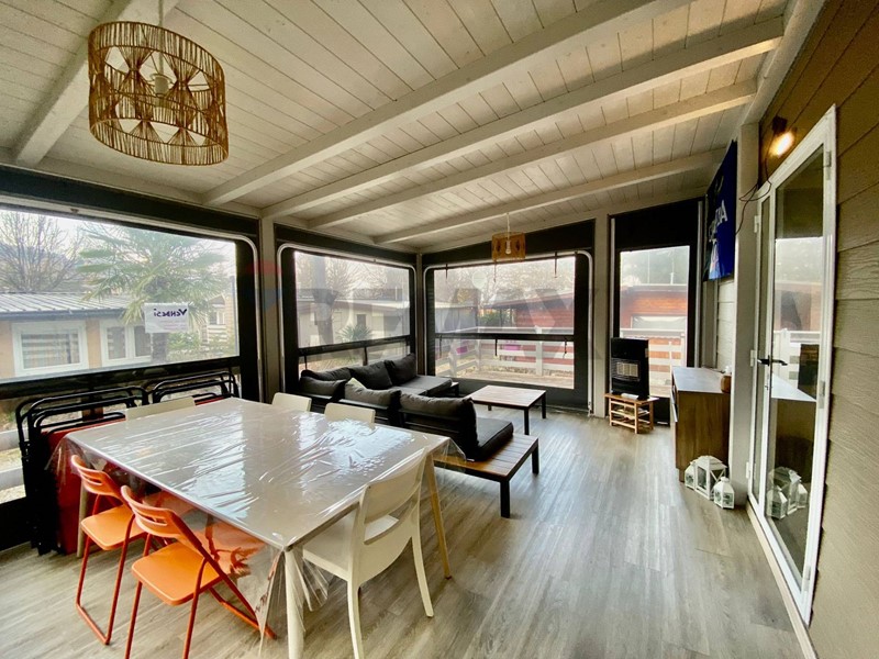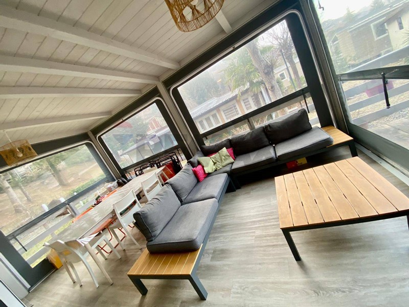 * **Veranda coperta**, completamente attrezzata con **zanzariere e coperture di plastica cernierato** regolabili, utilizzabile in ogni stagione.