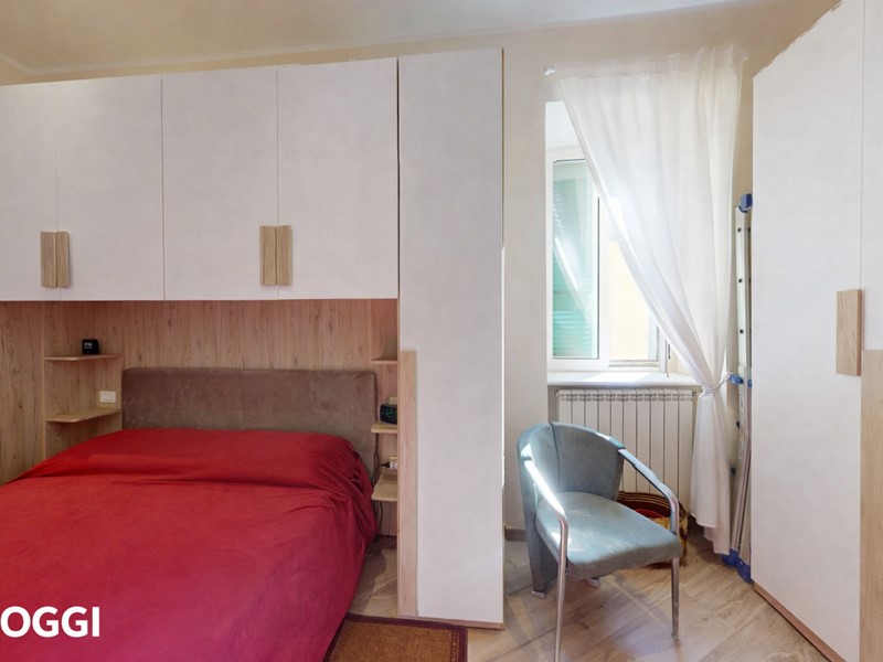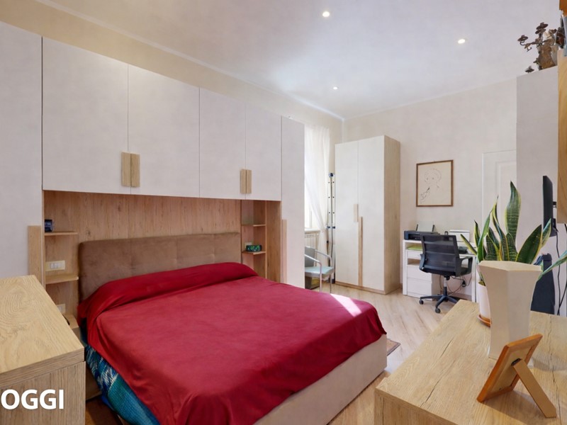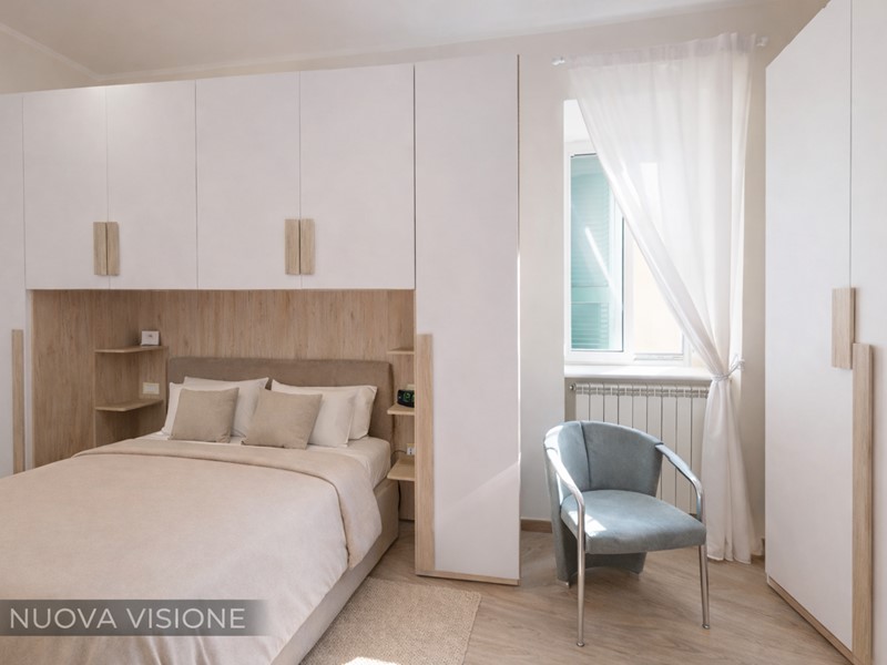 La camera da letto matrimoniale è confortevole e ben proporzionata, con armadiature su misura che aiutano a mantenere ordine e armonia.