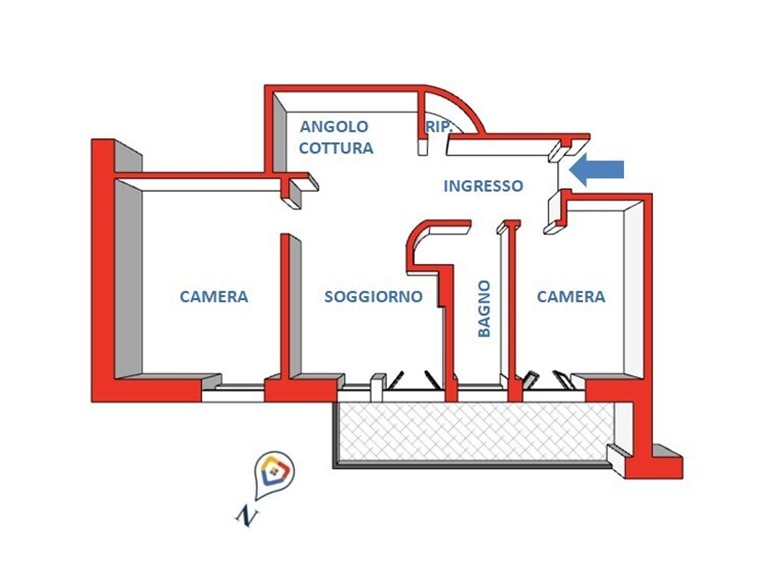 L'immobile si compone di un ingresso arredabile, un soggiorno open-space dotato di una profonda balconata terrazzata, angolo cottura, una bella camera matrimoniale, una camera singola anch'essa con accesso alla balconata, un nuovissimo bagno finestrato ed infine un ripostiglio.