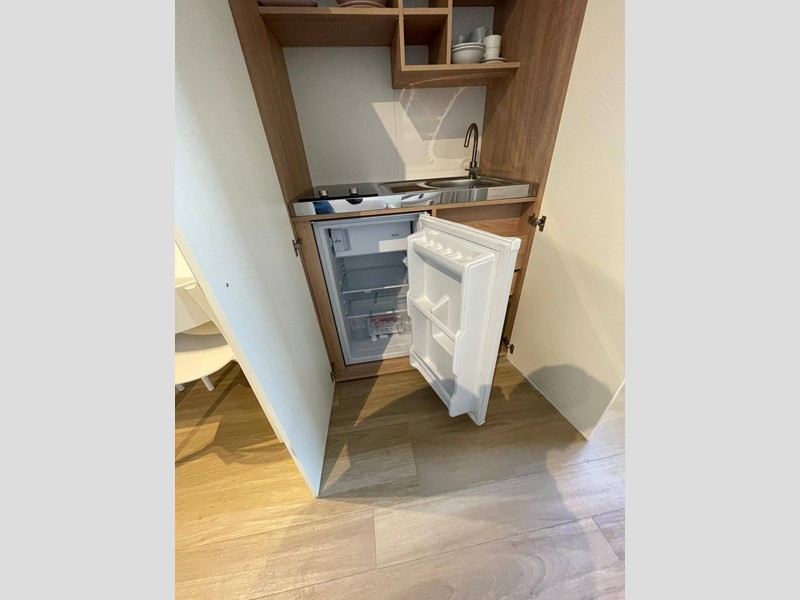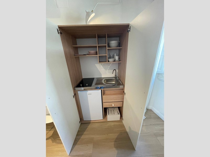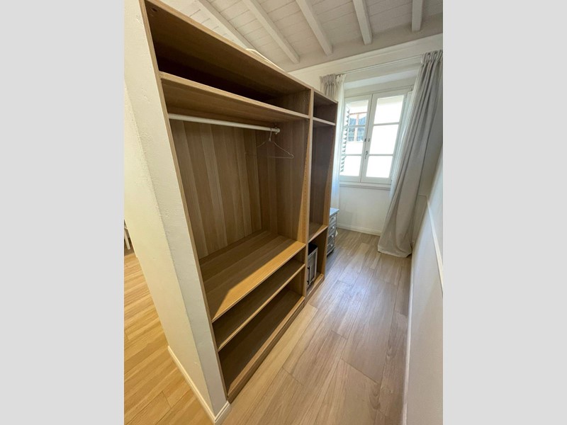 Gli ambienti sono impreziositi da parquet in tutta la casa, che conferisce continuità, calore ed eleganza. La cucina, dal design essenziale e funzionale, è dotata di piano a induzione, lavello e frigorifero con piccolo freezer.