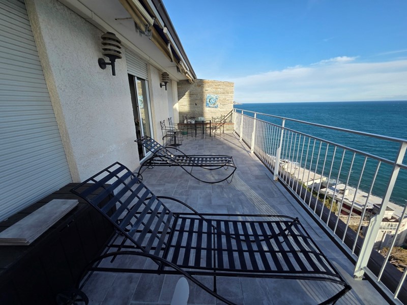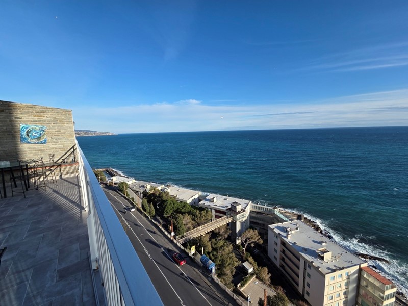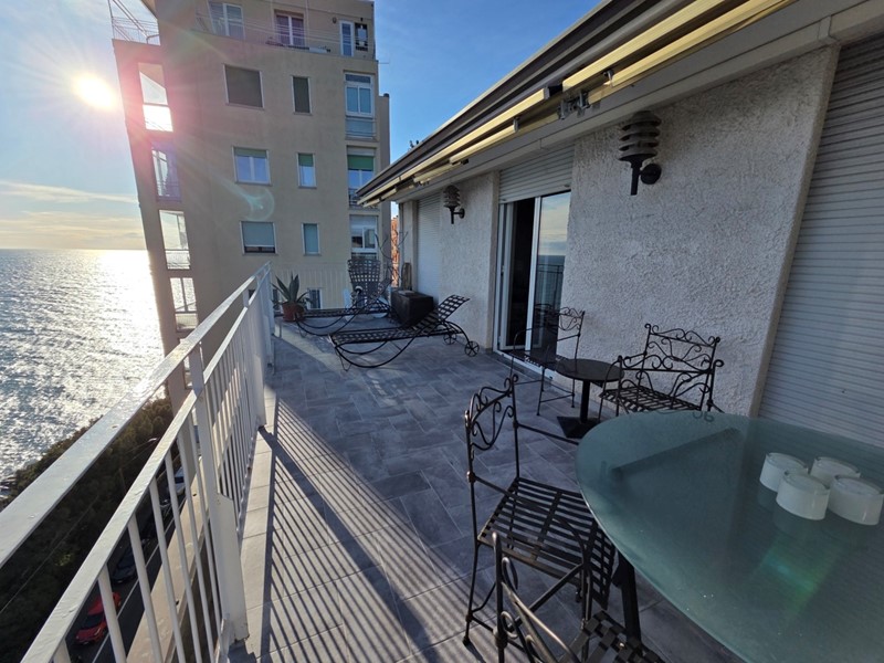 Sanremo, Capo Nero. Attico fronte mare, terrazza attrezzata con tende da sole per beneficiare del sole dall’alba al tramonto tutto l’anno.
