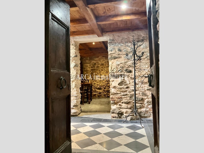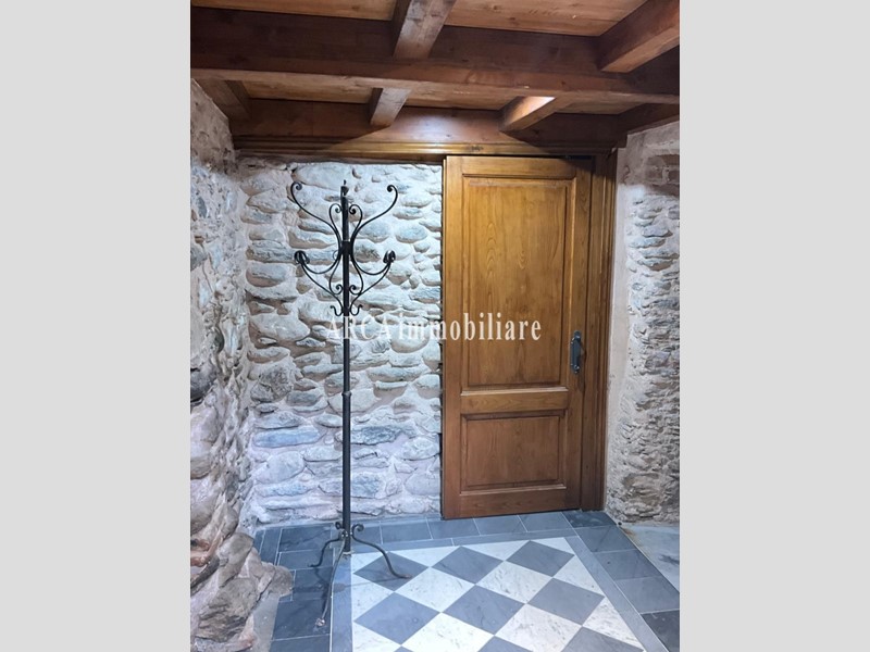 Dall'ingresso principale si accede ad un disimpegno che si affaccia sulla cucina abitabile, sulla sala con camino, 2 camere matrimoniali e un bagno. Scendendo poche scale si entra nel piano cantina, composto da un disimpegno, un bagno-lavanderia e 2 grandi stanze anche queste completamente e finemente ristrutturate riportando tutte le pareti in pietra originale e soffitto in legno. La cantina ha anche un accesso indipendente dal piano terra.