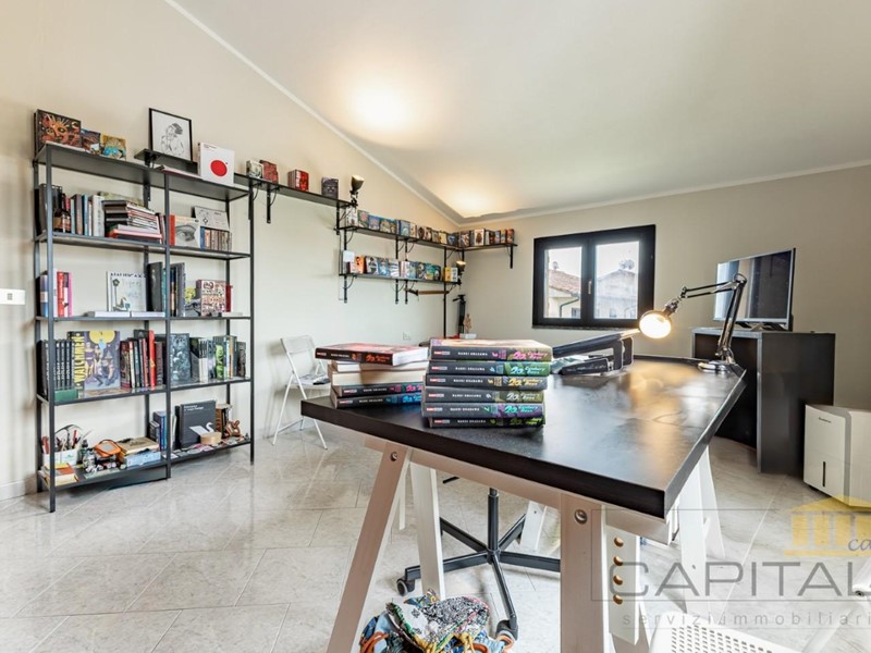 La scala in muratura ci porta al piano sottotetto (con altezza massima 3,4 mt) attualmente diviso in 4 locali pluriuso (camera, studio, palestra ecc..) un bagno ed un ripostiglio.