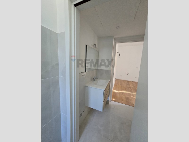 Pavimenti in parquet rovere sbiancato, rubinetteria New Form, sanitari sospesi Ideal Standard.