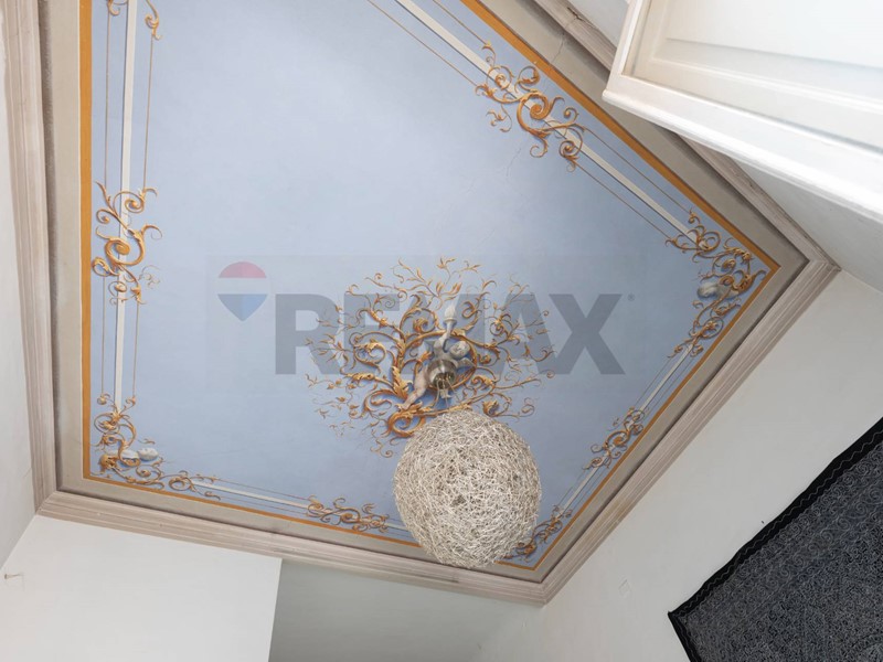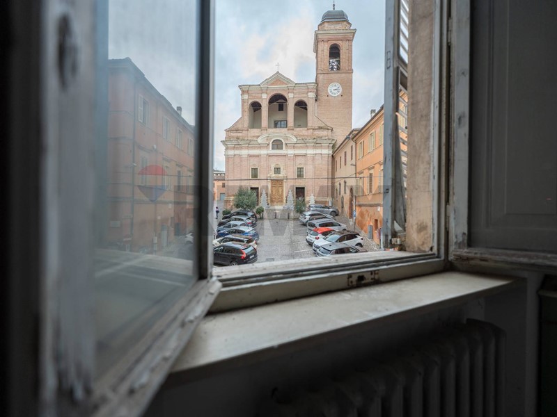 La zona giorno è composta da una cucina funzionale e da una sala pranzo luminosa, con affreschi al soffitto e vista sulla piazza principale.