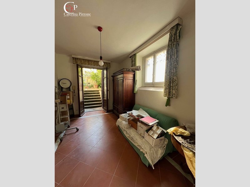 Il piano parzialmente seminterrato ospita tre ulteriori camere da letto di cui una matrimoniale, una grande stanza che ospitava l'originaria cucina depoca e ha mantenuto i relativi attacchi, un salotto con accesso diretto al giardino, ideale per garantire autonomia o per una diversa organizzazione degli spazi, un bagno, un locale di servizio adibito a lavanderia con uscita al giardino ed una cantina.