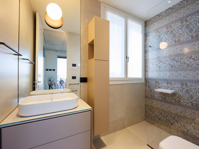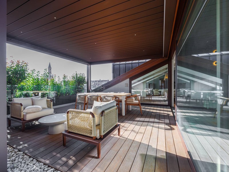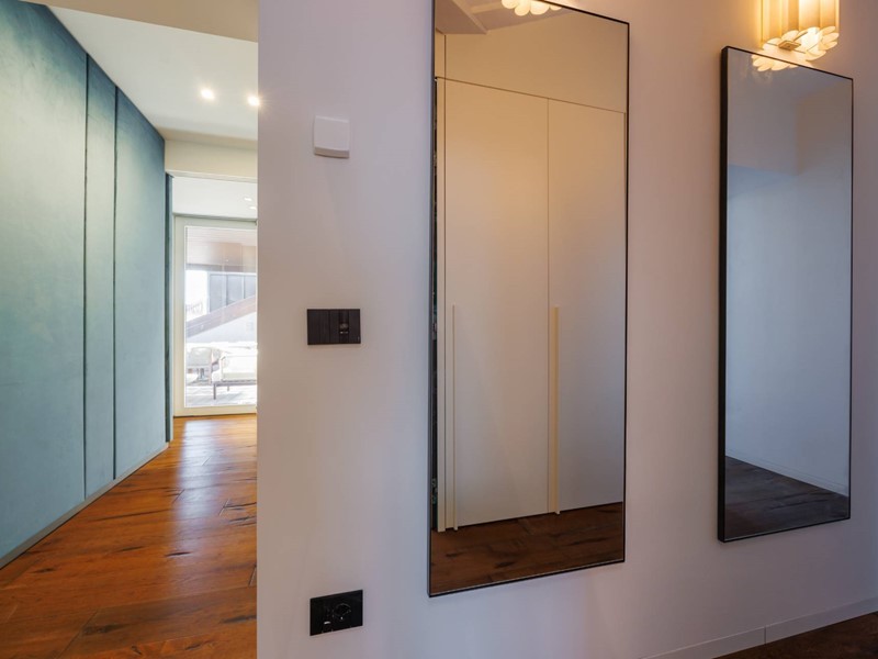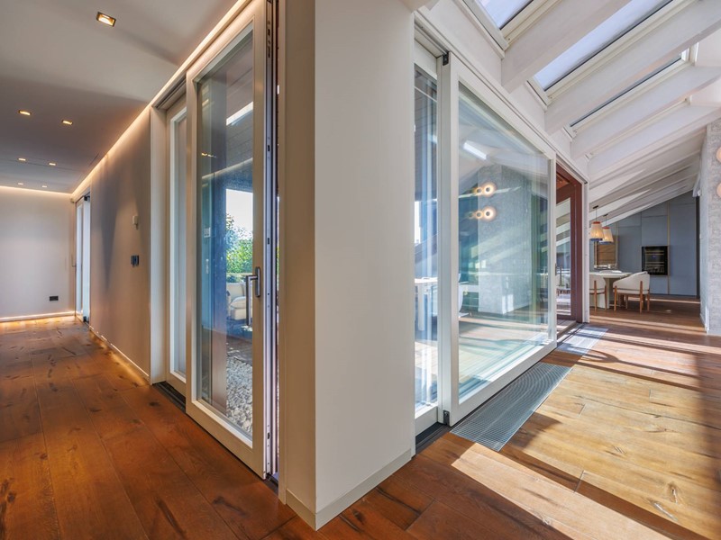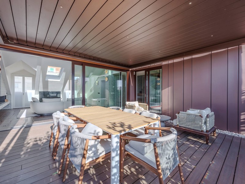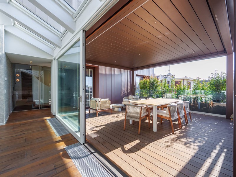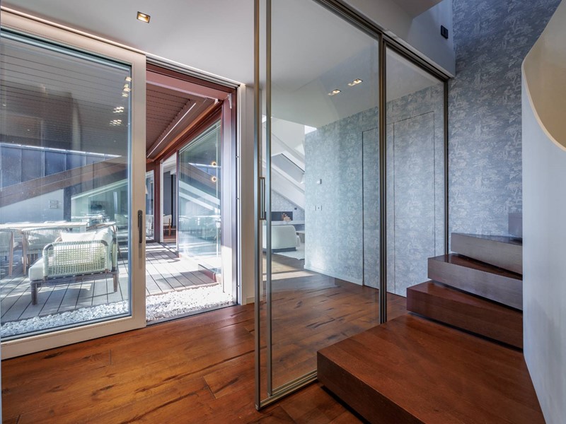 Lappartamento si sviluppa attorno alla grande terrazza panoramica, separata da un ampia parete vetrata.