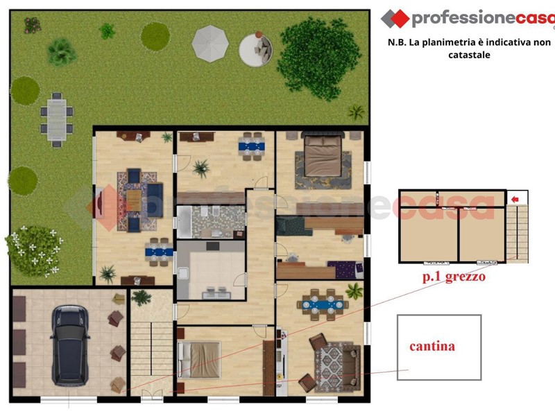 Al piano terra l'immobile è composto da ingresso corridoio, tre spaziose e luminose camere, ampio bagno completo di vasca, sala pranzo con angolo cottura e accesso ad un'ariosa veranda. A completare l'appartamento al mio terra, spazioso garage triplo di 35 mq circa allo stato grezzo e giardino di 325 mq circa in parte pavimentato con alberi da frutto e in parte lasciato ad area verde perfetto per trascorrere piacevoli momenti all'aperto.