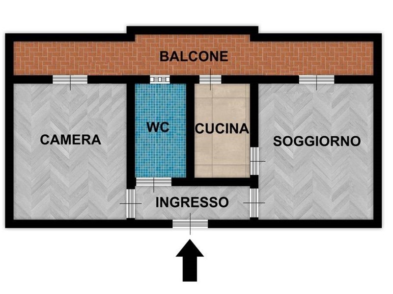 L'immobile, al piano rialzato, è composto da: ingresso, soggiorno, cucina, camera da letto e servizio igienico. Tutti i vani beneficiano di un ampio balcone con esposizione su atrio condominiale interno.