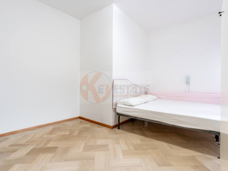 Lappartamento si sviluppa al primo piano di una palazzina ben curata con ascensore e giardino condominiale. Gli spazi sono razionali e ben divisi: due camere matrimoniali, cucina abitabile con balcone, salone generoso, ripostiglio e due bagni, uno con doccia e uno con vasca.