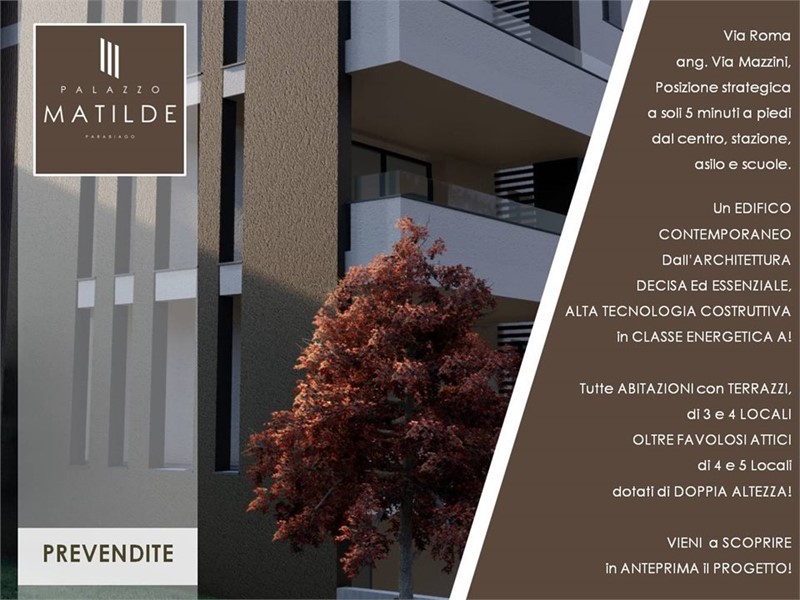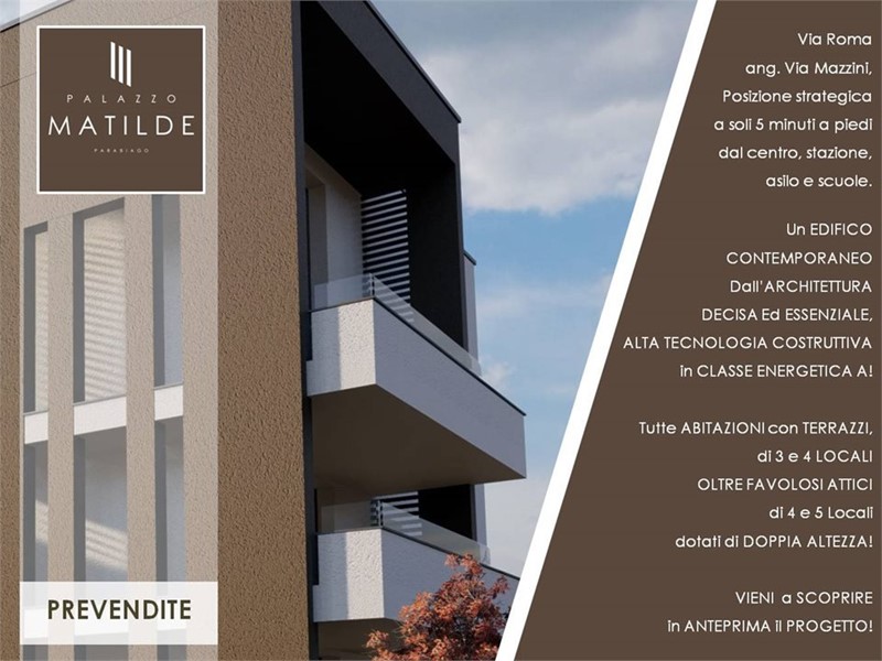 PALAZZO MATILDE è un edificio residenziale contemporaneo, dall'architettura decisa ed essenziale, progettato per distinguersi dai canoni estetici delle costruzioni degli ultimi anni, per le forme, per i colori delle facciate basato su gradazioni della terra in contrasto al bianco, per i colori dei serramenti scuro antracite, per i rivestimenti ricercati che in parte saranno presenti sulla facciata, e non da meno per i particolari ingressi sia pedonale che carraio progettati per enfatizzare l'accesso al palazzo.\nPALAZZO MATILDE verrà realizzato in via Roma ang. Via Mazzini, una posizione strategica a soli 10 minuti a piedi dal centro, dalla stazione e dalle scuole.\nPALAZZO MATILDE verrà costruito con materiali e tecnologie di ultima generazione, certificato in CALSSE ENERGETICA A4, oltre che ANTISISMICO, avrà una struttura in argisol, sistema costruttivo termo-acustico altamente performante, finestre e porte finestre in PVC sempre con elevato isolamento termo-acustico, tapparelle in alluminio coibentato, oltre impianti all'avanguardia come centrale termica elettrica con pompa di calore per la produzione di acqua calda e fredda, riscaldamento e raffrescamento radiante a pavimento, impianto di deumidificazione canalizzato di serie, impianto fotovoltaico, impianto elettrico con smart domotica di serie. \nPALAZZO MATILDE è un intervento residenziale che punta alla realizzazione di una casa bella, ricercata, studiata nei dettagli e negli spazi, oltre che ben costruita per soddisfare i più esigenti.\nPALAZZO MATILDE si compone da nove abitazioni tra soluzioni di tre locali, quattro locali oltre due favolosi attici di quattro o cinque locali con living a doppia altezza e soppalchi.\nTutti gli appartamenti disporranno di grandi terrazzi coperti e non verranno realizzati giardini privati, decisione volta a favorire un condominio raffinato e avvolto da un verde comune che trasmetta ordine e benessere visivo a chiunque lo viva o semplicemente lo osserva.\nPIANO RIALZATO : \nAPP. 1 - TRE LOCALI di 105 mq, TERRAZZO 20 mq, PREZZO and euro; 315.000\nAbitazione di tre locali di 105 mq, suddiviso in soggiorno, cucina abitabile o aperta sul living, terrazzo di 20 mq coperto, ripostiglio / lavanderia, doppi servizi, due camere matrimoniali e balcone. Esposizione est-sud-ovest.\nBOX SINGOLI and euro; 20.000\nBOX DOPPI IN LUNGHEZZA and euro; 40.000\nCANTINE and euro; 5.000\nALLACCI + ACCATASTAMENTO and euro; 5.000\n***INIZIO LAVORI LUGLIO 2026 - CONSEGNA FINE 2027*** - Maggiori Dettagli: Insonorizzazione, Cucina Abitabile, Porta blindata, Climatizzato