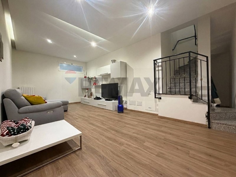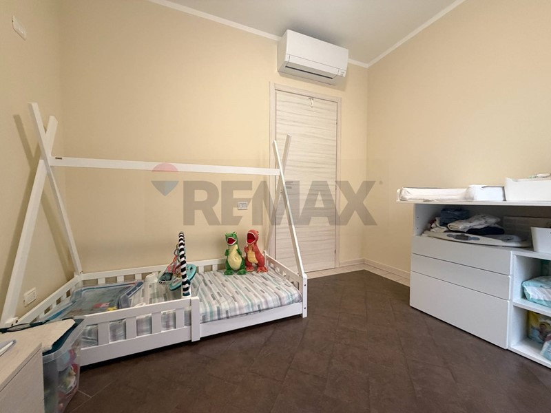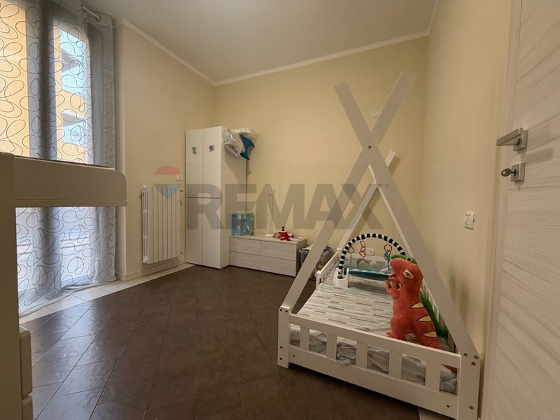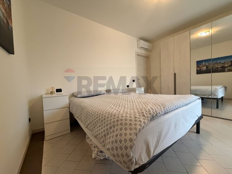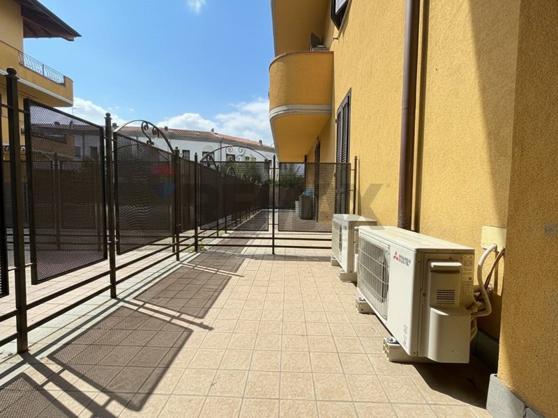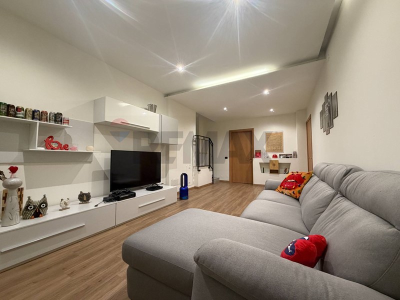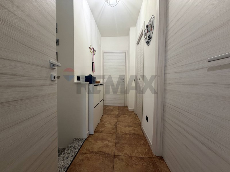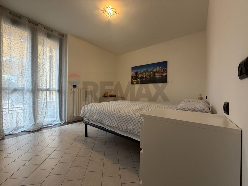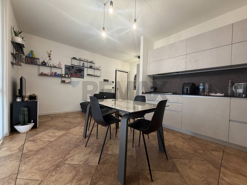 Accedendo all'appartamento veniamo accolti dall'ingresso che affaccia sulla zona giorno con cucina a vista. Da qui tramite ampia porta finestra giungiamo all'area esterna di proprietà in parte piastrellata ed in parte rifinita con erba sintetica.