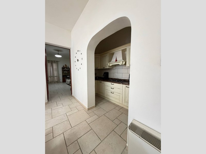 Lingresso conduce a una zona giorno open space con cucina a vista e sala da pranzo, resa particolarmente luminosa dalle ampie superfici finestrate. Il tinello abitabile, separata e funzionale, è collegata alla zona giorno tramite un elegante arco.