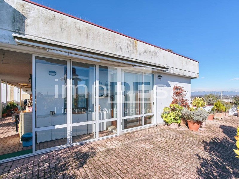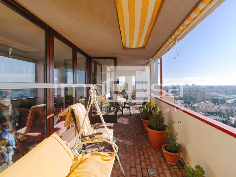 La vista panoramica dal terrazzo di 130 mq si estende dalle Dolomiti alla laguna di Venezia.