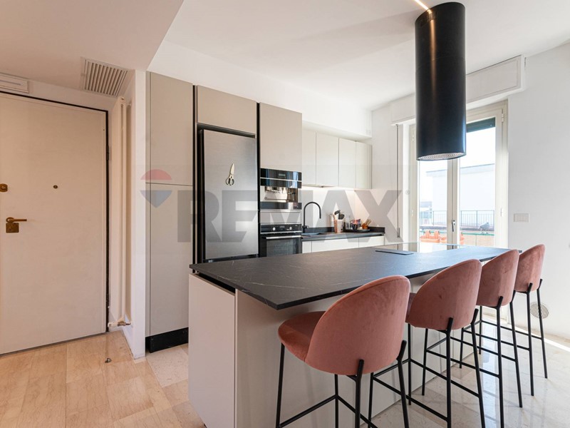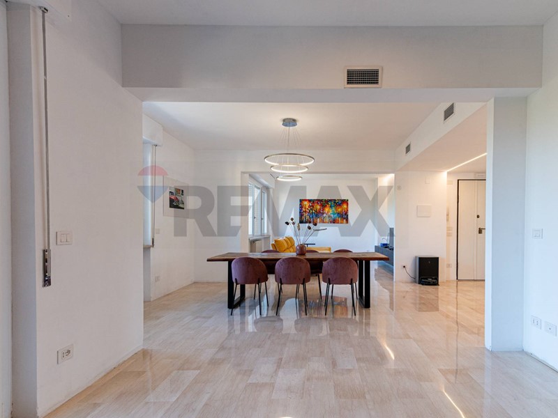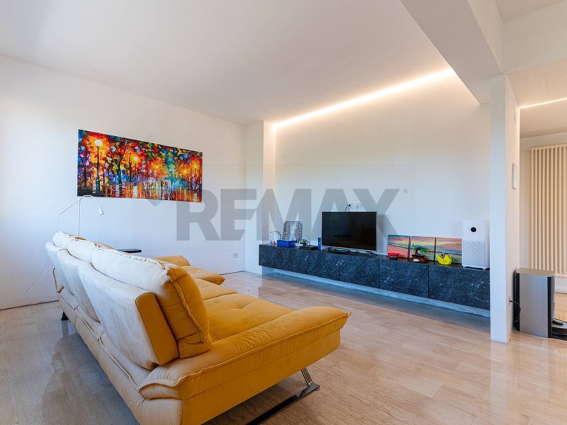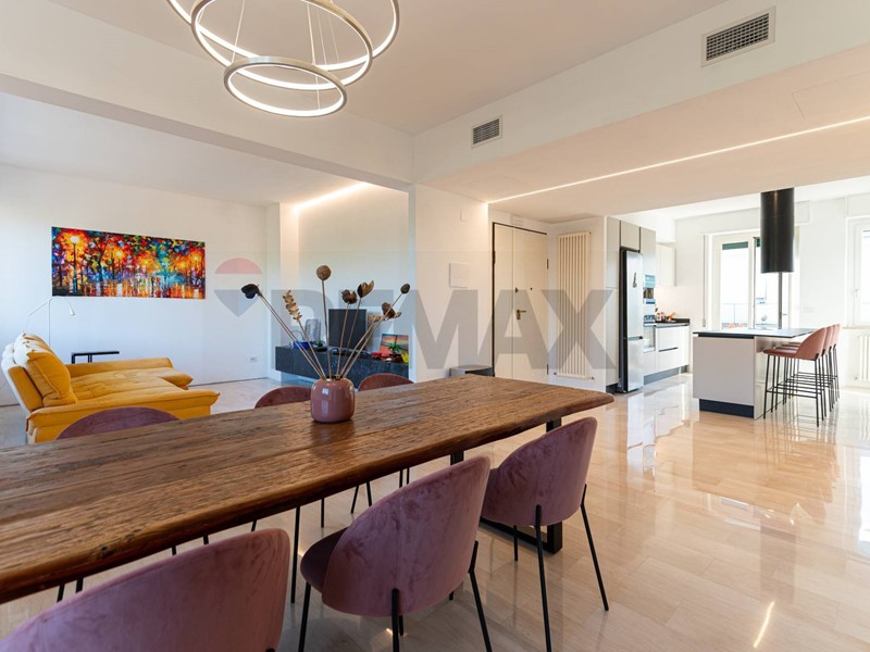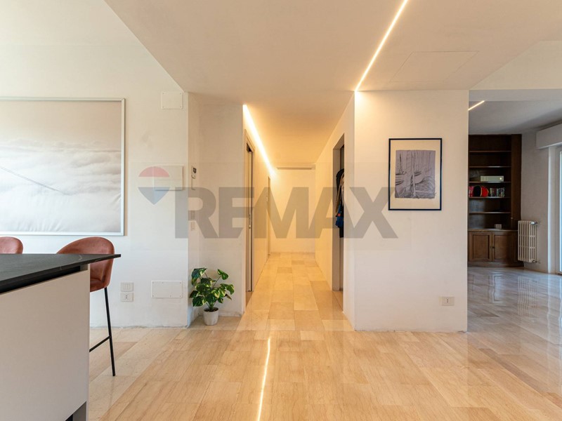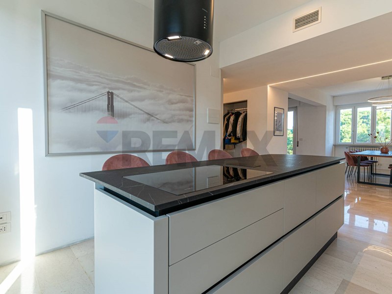 La zona giorno ci accoglie in un luminoso e spazioso salotto di circa 45mq dove sono presenti due ampie finestre ed un finestrone dal quale si accede ad una terrazza con vista sul verde dei giardini antistanti; la cucina anch'essa grande con balcone e funzionale isola centrale. Un corridoio ci porta nella zona notte dove troviamo un bagno principale finestrato con antibagno ad uso lavanderia, una generosa matrimoniale con cabina armadio e bagno privato finestrato, due camere matrimoniali. Al piano seminterrato presenza di due posti auto coperti nello spazio condominiale.