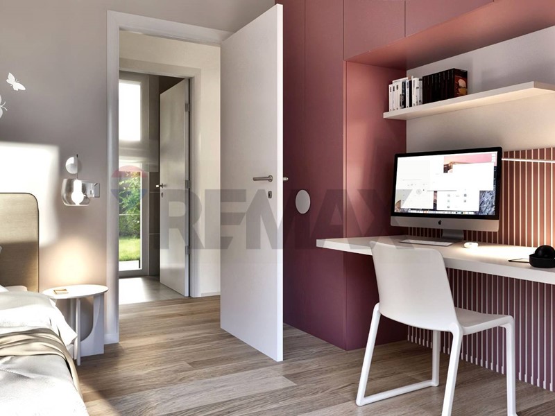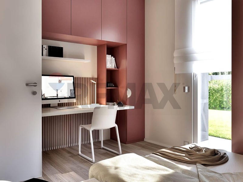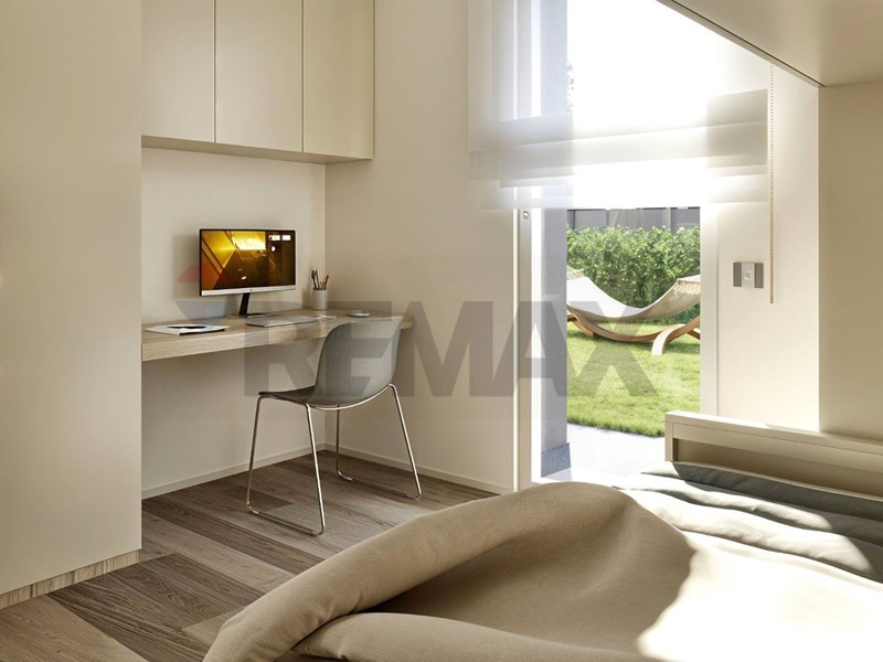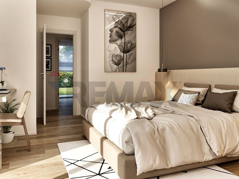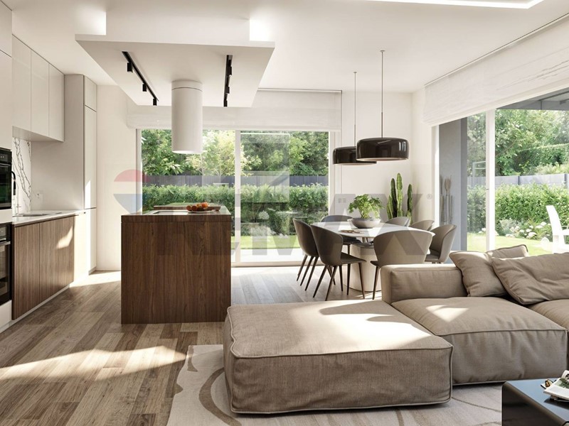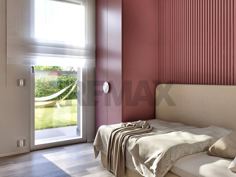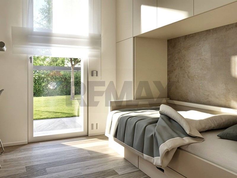 Lingresso indipendente da via Madre Teresa di Calcutta conduce a una casa funzionale e raffinata. La zona giorno open space è illuminata da grandi vetrate che si affacciano sul giardino, creando un dialogo fluido tra interno ed esterno.