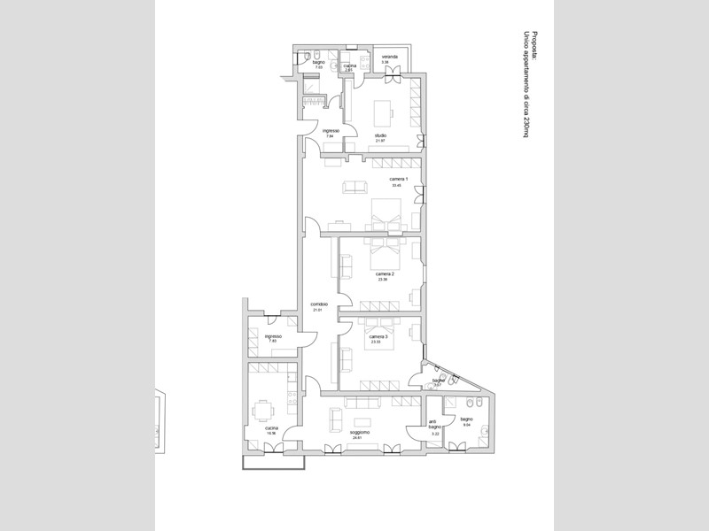 ingresso, soggiorno (24.61 mq) ampio e luminoso, cucina abitabile (16.56 mq) spaziosa e conviviale, veranda, 3 camere da letto (23.33 mq, 23.38 mq, 33.45 mq), studio/camera (21.97 mq) perfetto per lavoro, hobby o quarta camera da letto e 3 bagni (9,04 mq, 7.03 mq, 3.57 mq) più antibagno.