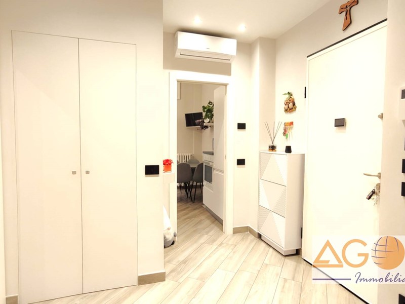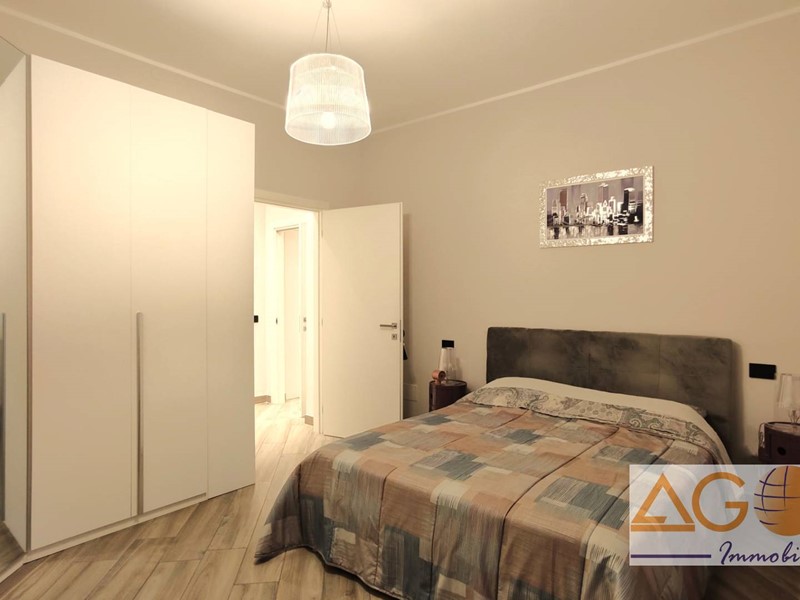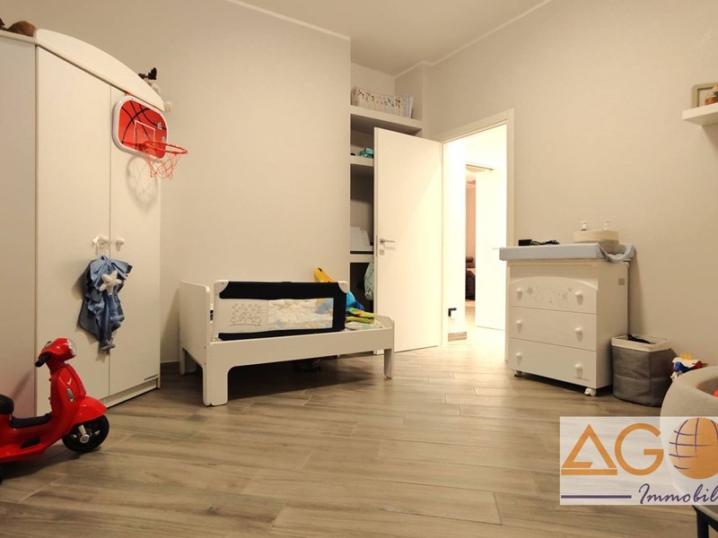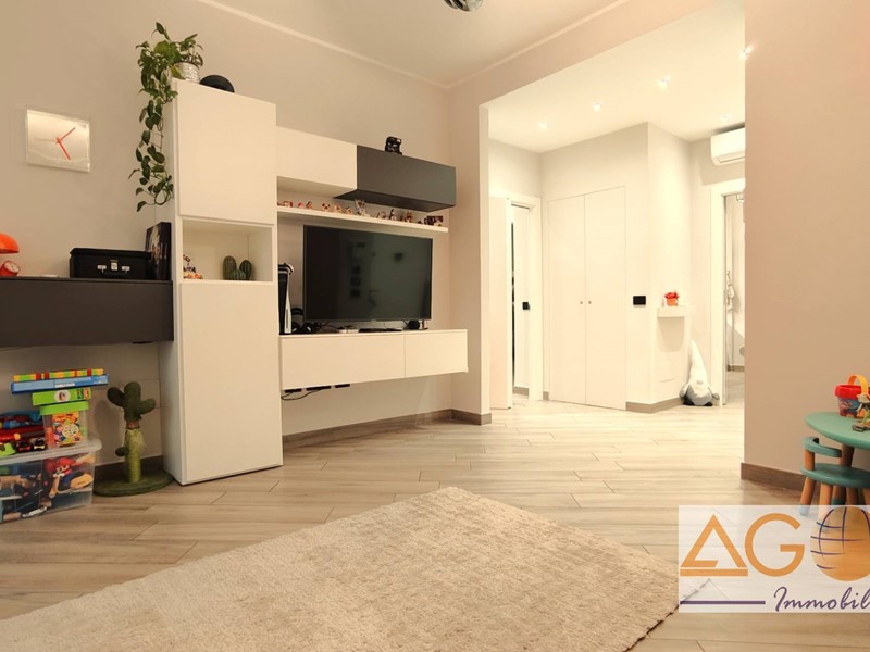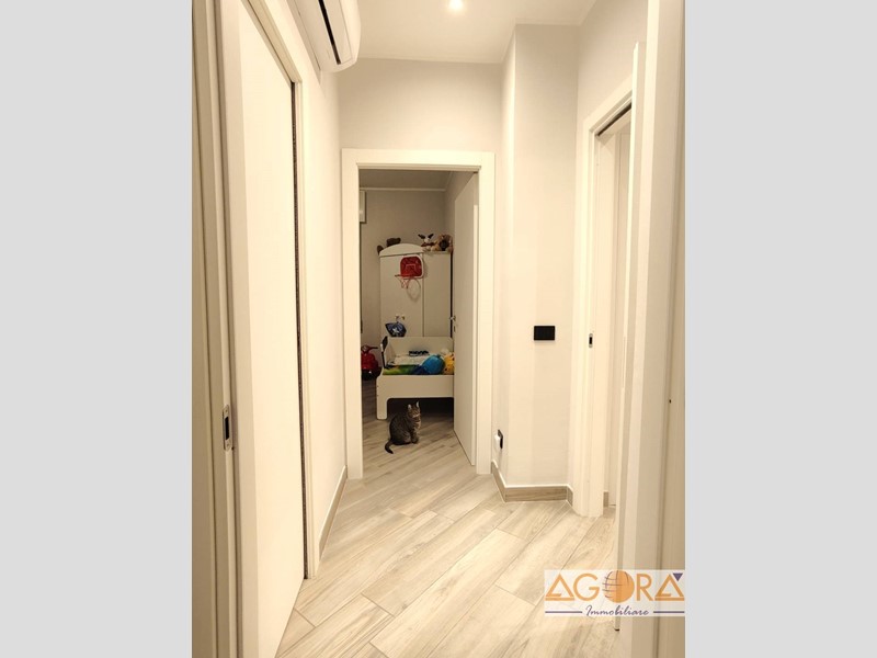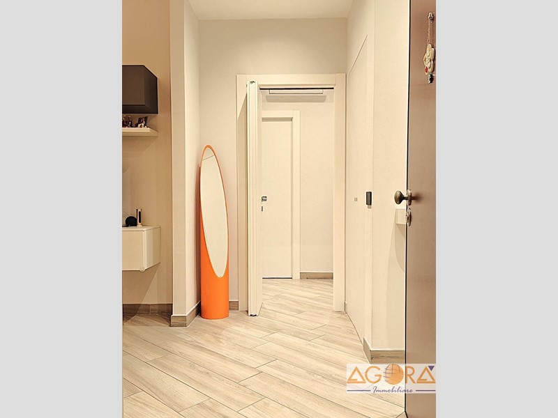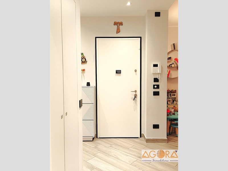 L'immobile si distingue per una distribuzione funzionale degli spazi: l'ingresso conduce a una luminosa zona living e a una cucina abitabile, entrambe con accesso diretto ai due balconi. La zona notte comprende due ampie camere da letto matrimoniali, un bagno con doppio lavabo e un pratico ripostiglio attrezzato, con attacchi per lavatrice e asciugatrice. Le finiture di pregio includono pavimentazione in gres porcellanato effetto legno, infissi in pvc con vetrocamera ad alto isolamento termico e una moderna controsoffittatura con faretti nell'area d'ingresso e del disimpegno. L'abitazione è dotata di comfort tecnologici avanzati, tra cui un sistema di domotica integrata per la gestione di luci, riscaldamento e sicurezza, oltre a porta blindata, videocitofono e impianto di climatizzazione con pompa di calore. La proprietà è completata da una cantina e un box auto singolo.