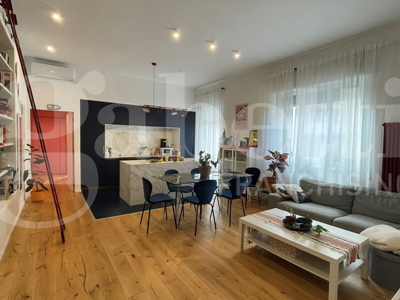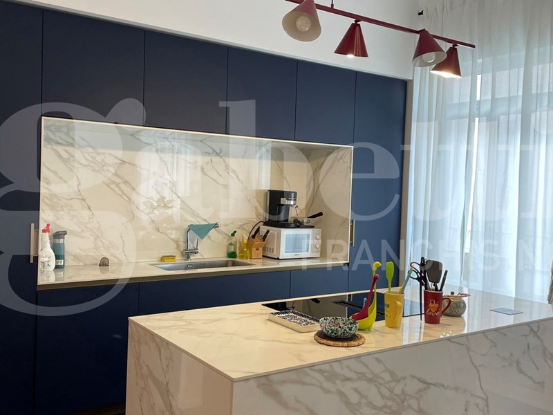 Ampio living con angolo cottura ad isola, tre camere, disimpegno con ripostiglio, bagno di design, due balconi, cantina e posto auto condominiale.