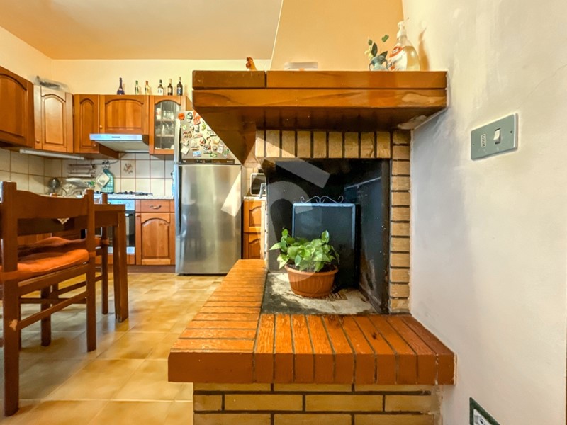 Dalla zona living si accede alla cucina separata, funzionale e accogliente, dotata di camino e con uscita su un secondo balcone.
