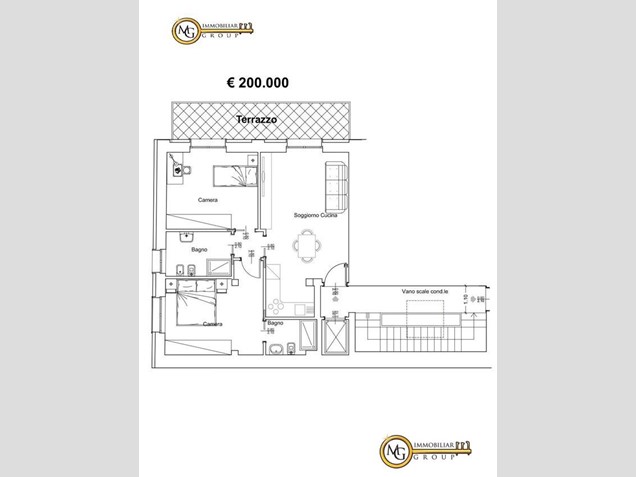 L'abitazione si apre su una luminosa e spaziosa zona giorno, composta da un ampio soggiorno con angolo cottura integrato che gode di un'ottima esposizione grazie alle grandi portefinestre con accesso diretto alla balconata frontale. Un funzionale disimpegno separa l'area living dalla zona notte, dove si trovano la camera matrimoniale, una seconda camera da letto e i doppi servizi, di cui uno principale finestrato e un secondo bagno dotato di impianto di aspirazione forzata.