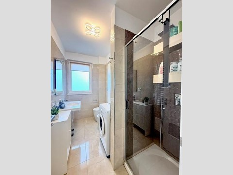 Si compone di: ingresso in una luminosa sala con angolo cottura, 1 camera matrimoniale, 1 camera doppia (con letto matrimoniale) e 1 camera singola (con letto matrimoniale), 2 bagni finestrati ( di cui uno con doccia e uno con vasca ), terrazzo (disposto a elle abitabile) adiacente alla sala e angolo cottura, terrazzo(B) sul retro con lavatoio.