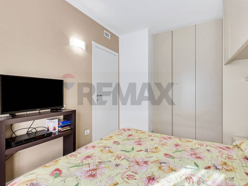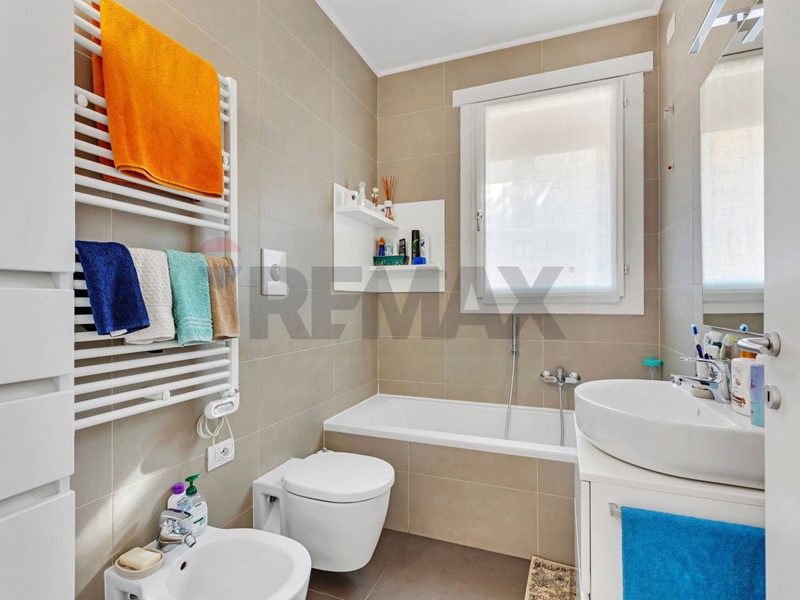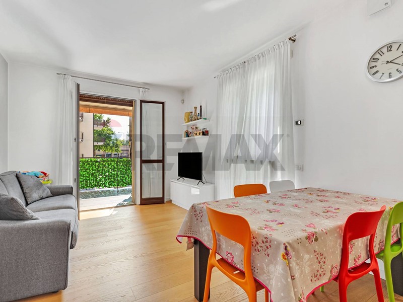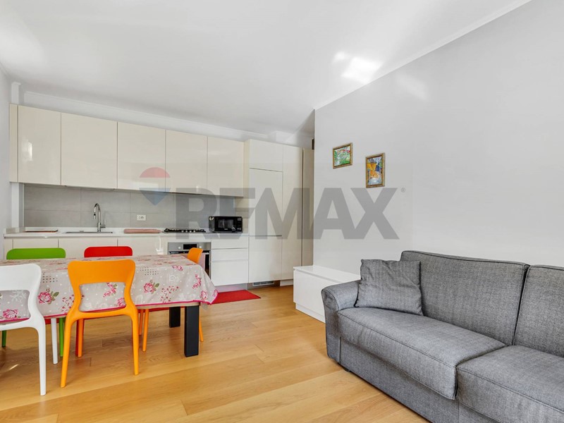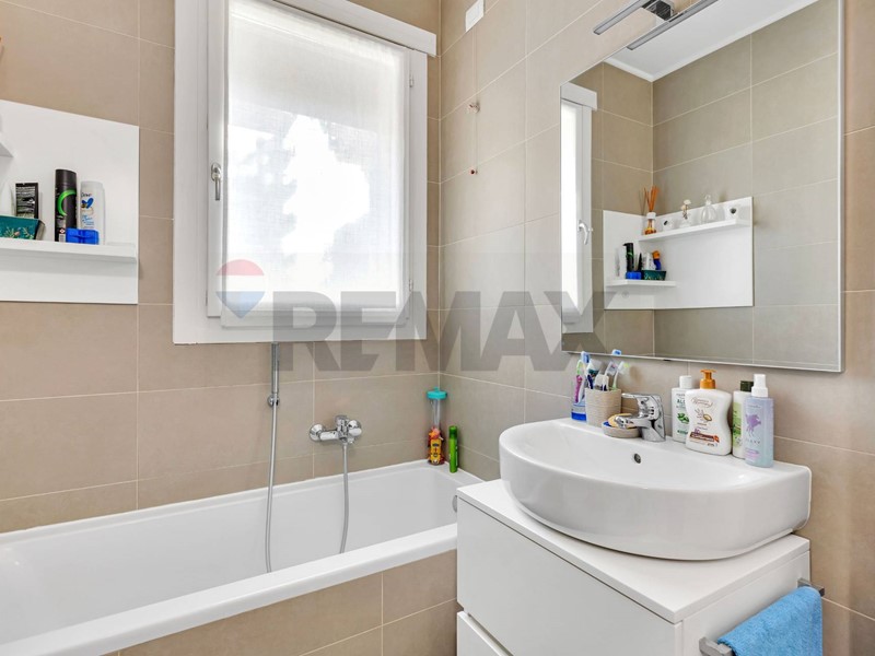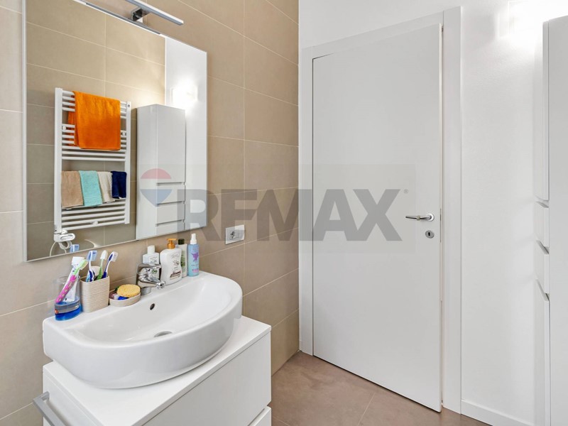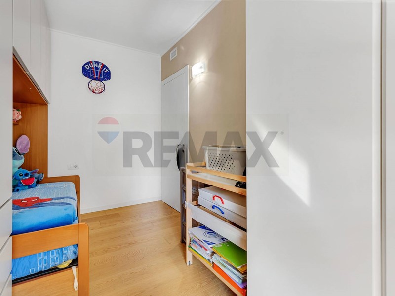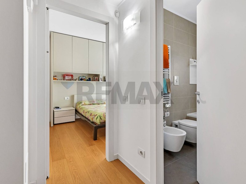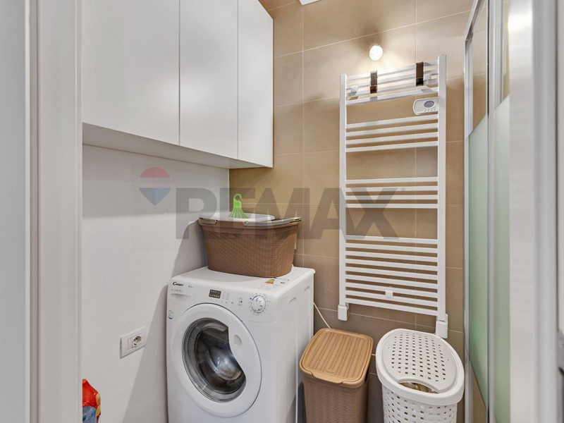 L'appartamento è composto da un ingresso che tramite un breve corridoio ci accompagna verso un luminoso soggiorno dal doppio affaccio con ampio terrazzino coperto e cucina a vista, sempre dall'ingresso un disimpegno introduce la zona notte con camera matrimoniale, cameretta e un bagno con vasca; è presente inoltre un comodo locale lavanderia comprensivo di doccia con già tutte le predisposizioni per realizzare un secondo bagno completo.