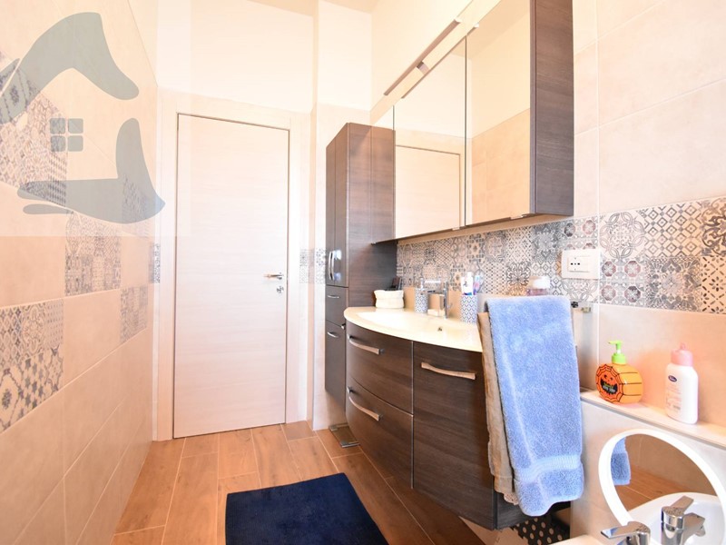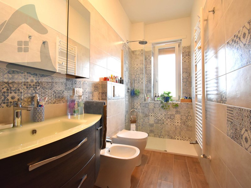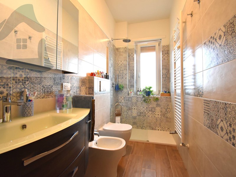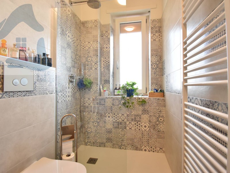 Il bagno, ristrutturato in chiave contemporanea, è dotato di ampia doccia walk-in e termoarredo, con rivestimenti decorativi che conferiscono carattere allambiente.