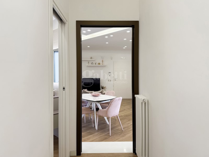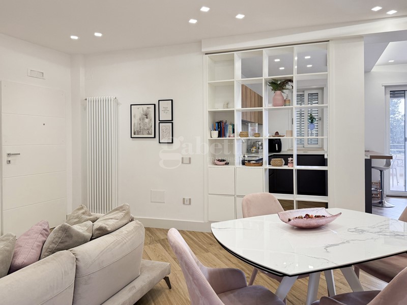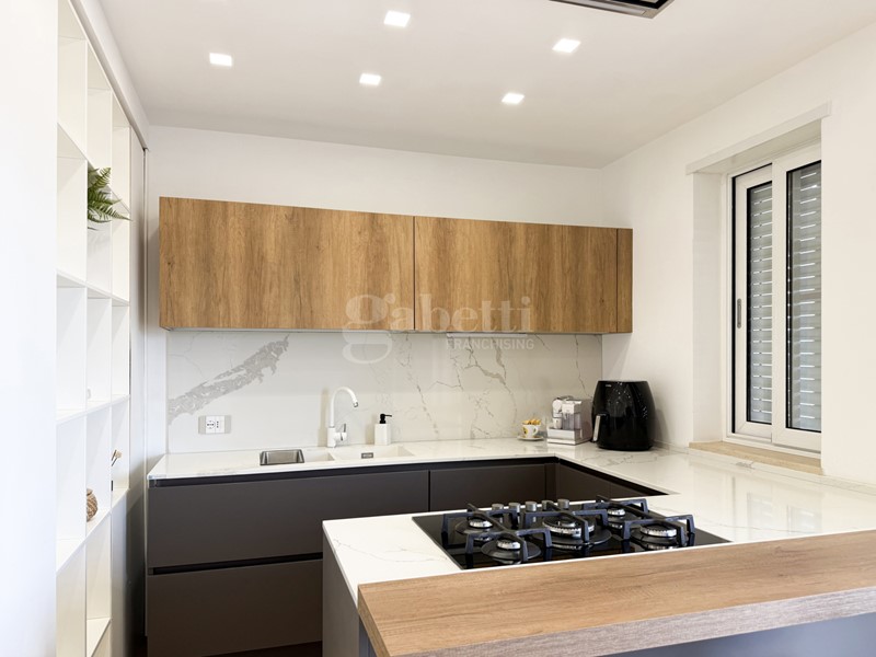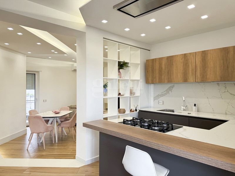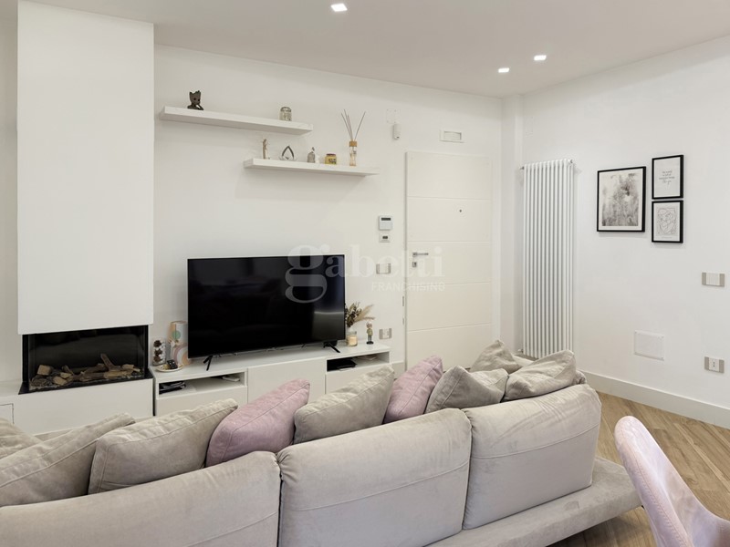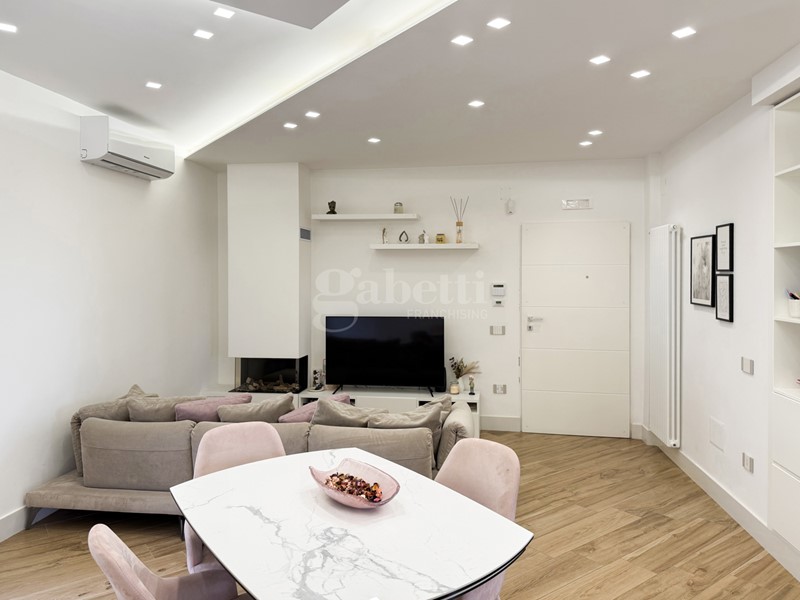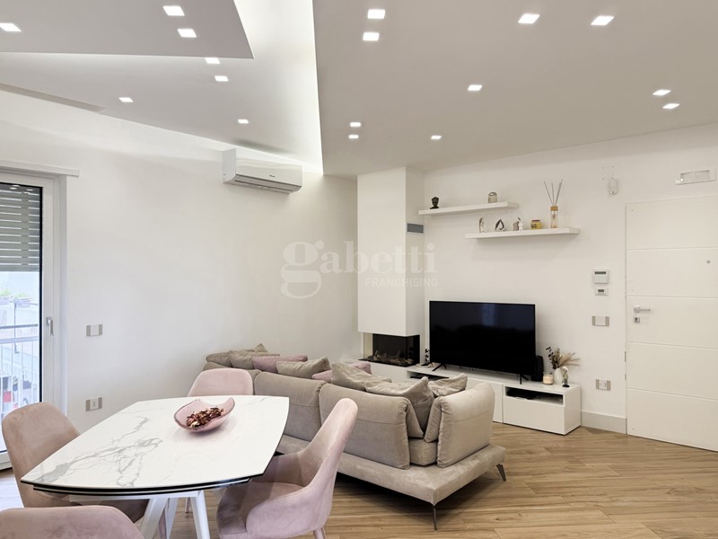 L'ingresso dell'appartamento introduce in un living ampio e luminoso, caratterizzato da linee contemporanee e spazi ben distribuiti, dotato di impianto d'allarme e cronotermostato digitale per una gestione ottimale del comfort e della sicurezza. L'ambiente è impreziosito da un camino a bioetanolo, che dona calore e atmosfera, ed è in perfetta continuità con una cucina moderna con penisola, ideale per momenti di convivialità e vita quotidiana. Un pratico ripostiglio completa la zona giorno, assicurando ordine e comfort.