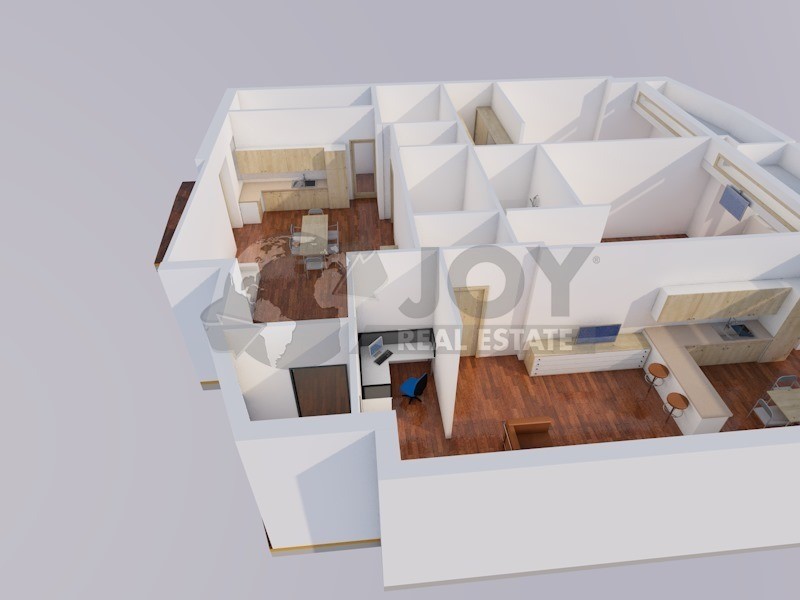 L’appartamento di circa 78 mq. è composto da ingresso/soggiorno con angolo cottura, due bagni e camera da letto con cabina armadio.