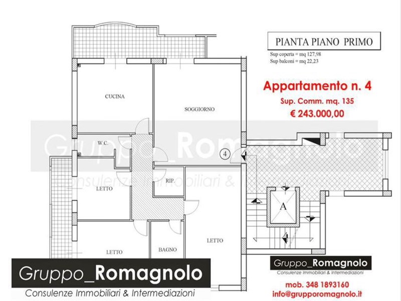 appartamento (NUOVO) a piano primo con superficie commerciale di mq. 135, costituito da ingresso/living con separata cucina, n.3 camere, ripostiglio, wc/lavanderia, bagno, balconi (mq. 22,23) e posto macchina esclusivo.