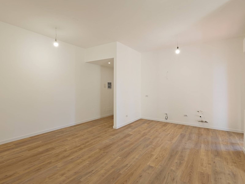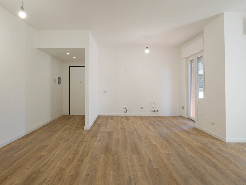 Ingresso su zona giorno, ampia e luminosa, con cucina a vista e accesso al balcone con affaccio sul giardino.