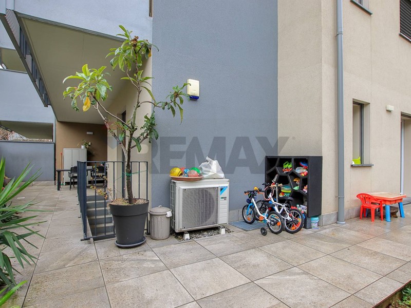 L'area esterna gira su due lati ed è di circa mq 70, di cui una parte piastrellata ed una prato.