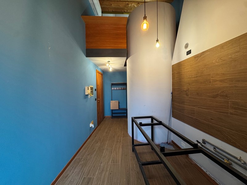 L'ingresso conduce direttamente alla zona giorno, composta da cucina con angolo cottura, un piccolo salottino e un bagno dotato di box doccia. Una scala a chiocciola collega questo livello al piano superiore, dove si trova la camera da letto.