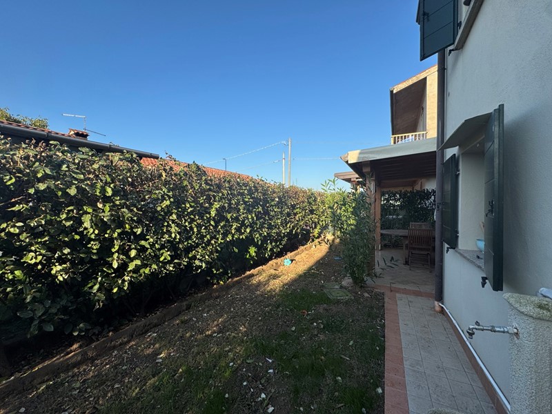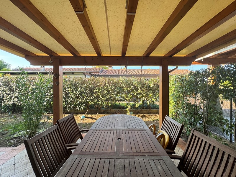 Il retro della casa ospita un piccolo giardino di proprietà con portico, il luogo perfetto per trascorrere piacevoli momenti all'aria aperta in totale privacy.