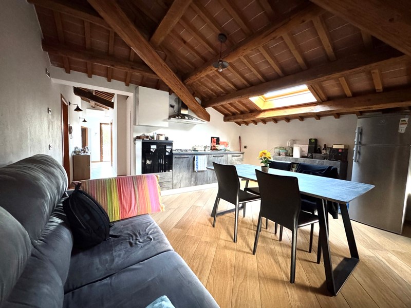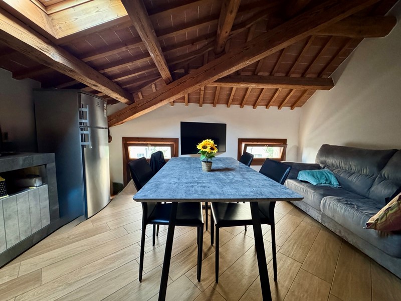 L'abitazione si apre su un accogliente open space con cucina e soggiorno, ideale per chi ama ambienti ariosi e conviviali.
