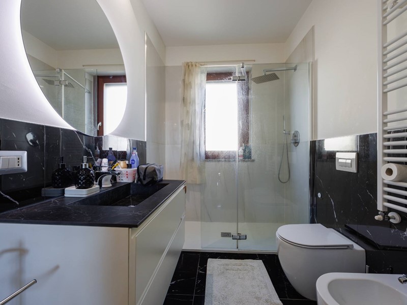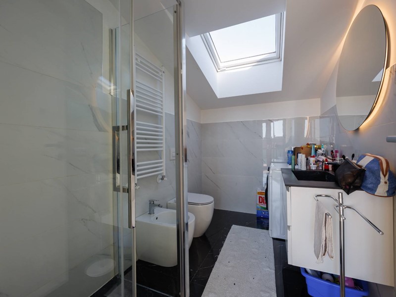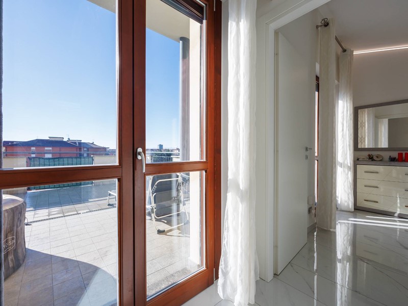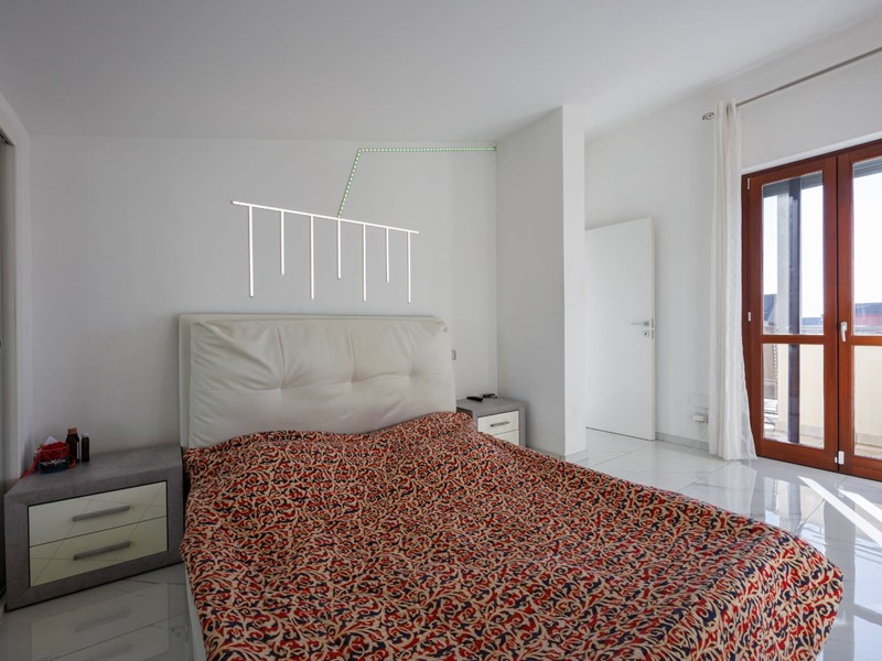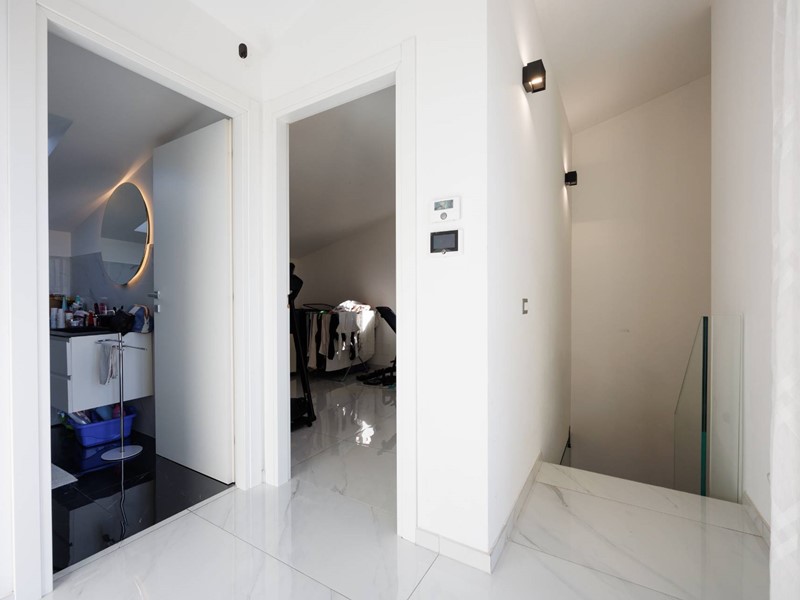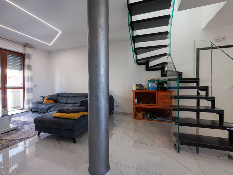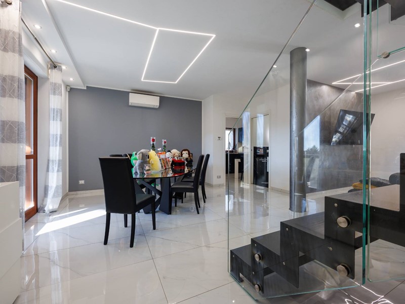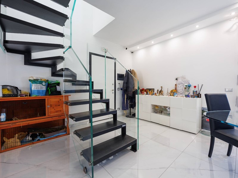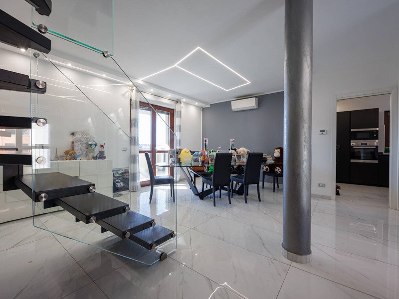 Una raffinata scala in vetro con illuminazione a LED accompagna al piano superiore, dove si sviluppa la zona notte con camera matrimoniale, seconda camera e bagno con box doccia. Il valore aggiunto di questo livello è lampio terrazzo di circa 30 mq, uno spazio riservato e panoramico, ideale per godere di piacevoli momenti allaperto e di suggestivi tramonti.