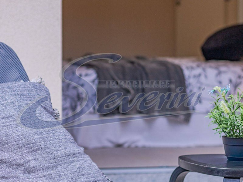 Zona Giorno: Luminoso open space che unisce soggiorno e cucina, dove da qui si accede ad uno spazio esterno di 27 mq perfetto per pranzare all'aperto e rilassarsi.