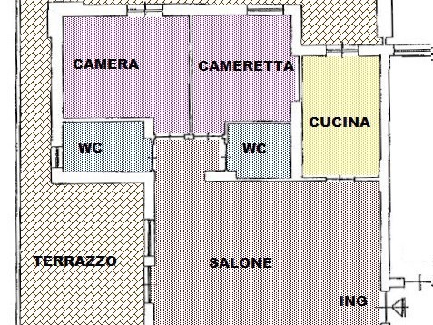 Composizione interna: ingresso su ampio salone a vista, luminoso e accogliente, con accesso diretto a un terrazzo vivibile, cucina abitabile, separata e funzionale, con accesso a un balcone comunicante con il terrazzo.