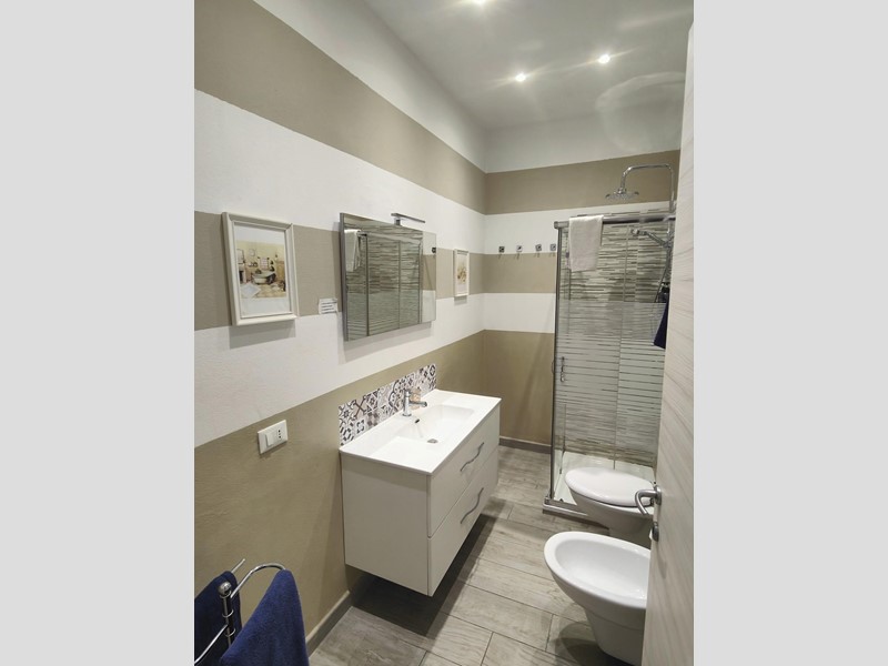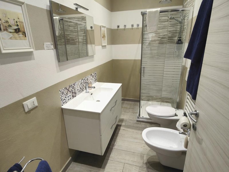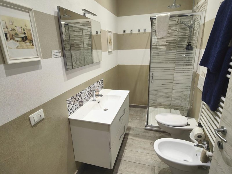 Un bagno con doccia, rifinito con cura.