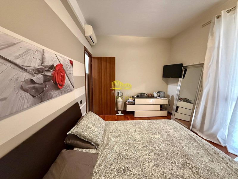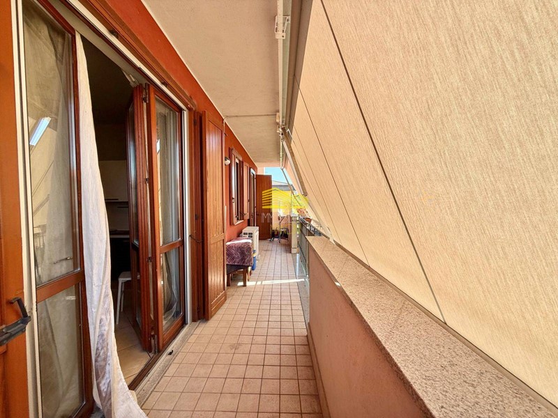 Ingresso in corridoio con armadiatura e ripostiglio, luminosa zona living con cucina a vista e accesso su TERRAZZINO di 14 mq, disimpegno, bagno finestrato con doccia, cameretta (con secondo accesso su terrazzo) e camera matrimoniale con sbarco su BALCONE di 7 mq.