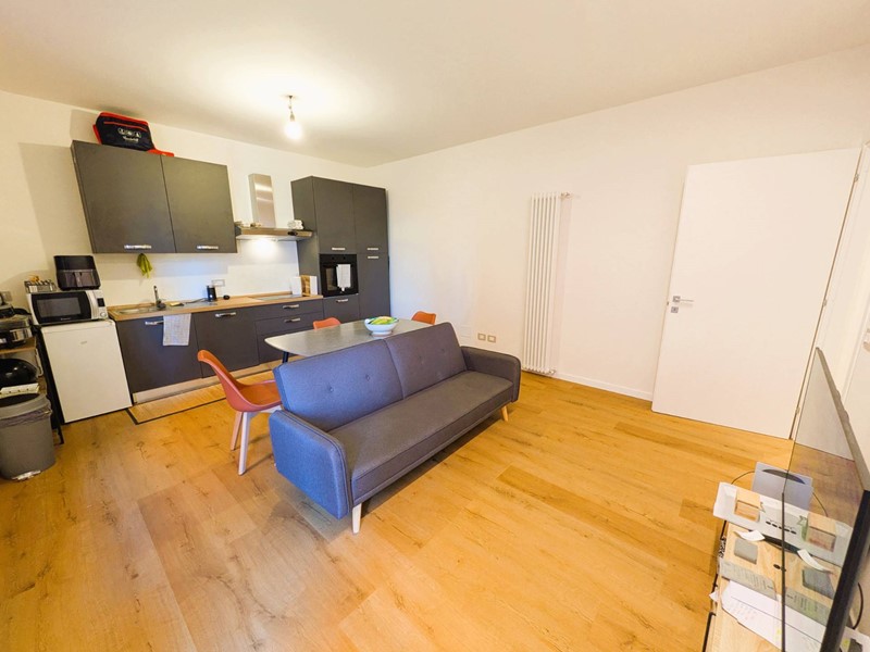 Zona Giorno: Ingresso su un luminoso soggiorno con angolo cottura a vista e accesso diretto al balcone.